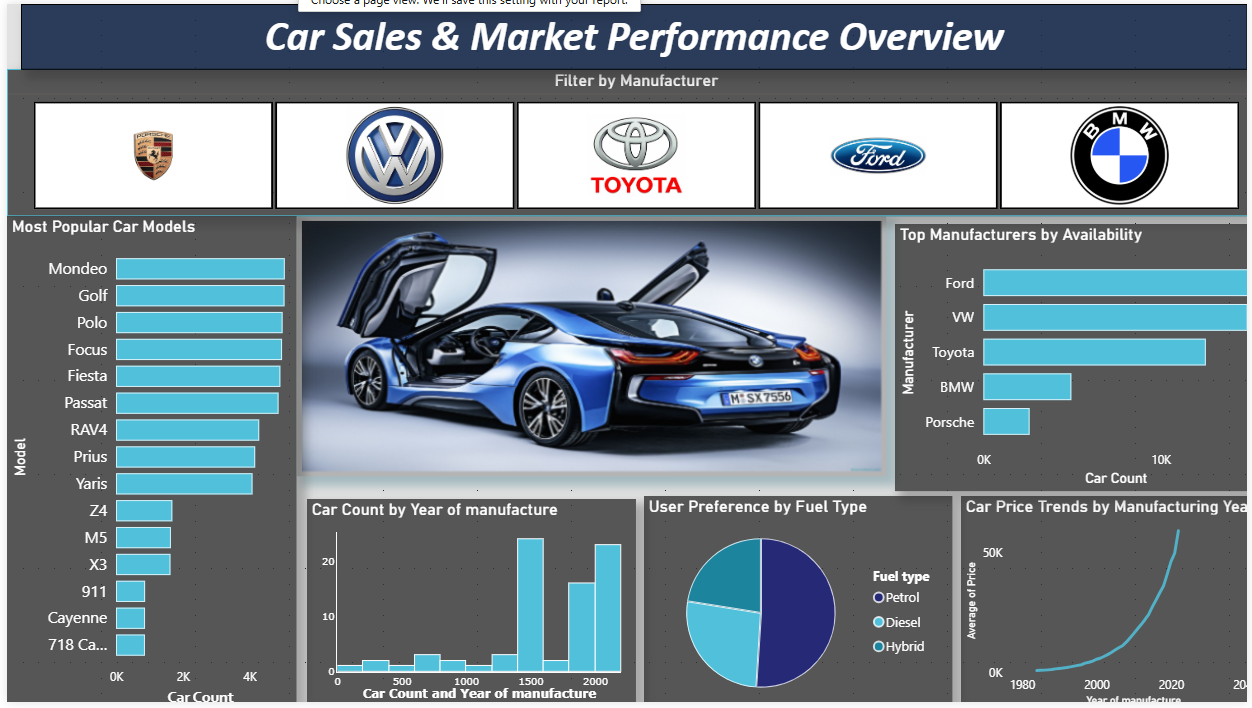 Analyse vehicle sales and market trends with this Automotive Sales Power BI dashboard template designed for performance and pricing insights. This Automotive Sales Power BI dashboard template highlights key metrics such as car availability, model popularity, manufacturer performance, and pricing trends over time. It also provides insights into fuel type preferences, production distribution by year, and shifts in market demand across brands. This Automotive Sales Power BI dashboard template is ideal for automotive analysts, dealership managers, and business strategists who need to monitor market dynamics and customer preferences. It helps identify top-performing models, compare manufacturers, and support data-driven decisions for inventory planning and sales strategies. The dashboard includes trend line charts for price analysis, bar charts for manufacturer comparison, distribution visuals for car models and production years, and filters for brand-level exploration. Interactive slicers allow users to focus on specific manufacturers and analyse performance in detail. Download this Automotive Sales Power BI dashboard template and start tracking car sales trends and market performance effectively.