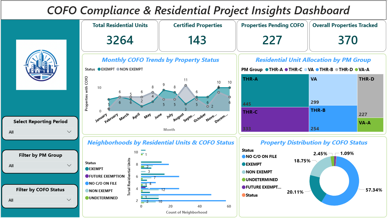 The Property Compliance Power BI Dashboard Template helps track COFO certification status, residential unit distribution, and compliance performance across properties. This Property Compliance Power BI Dashboard Template includes key metrics such as total residential units, property status, COFO certification trends, and compliance categories to evaluate regulatory performance effectively. It also highlights neighborhood-level unit distribution and PM group performance for operational insights. Designed for property managers, compliance teams, and real estate analysts, this Property Compliance Power BI Dashboard Template helps identify compliance gaps, monitor certification progress, and improve regulatory planning. It solves challenges related to tracking property compliance and managing certification data across multiple locations. The dashboard includes visuals such as certification trend charts, compliance category distribution graphs, neighborhood comparison visuals, and PM group performance charts. Interactive filters allow users to explore data by reporting period, PM group, and COFO status for deeper analysis. Download this Property Compliance Power BI Dashboard Template and start analysing compliance performance and certification trends today.