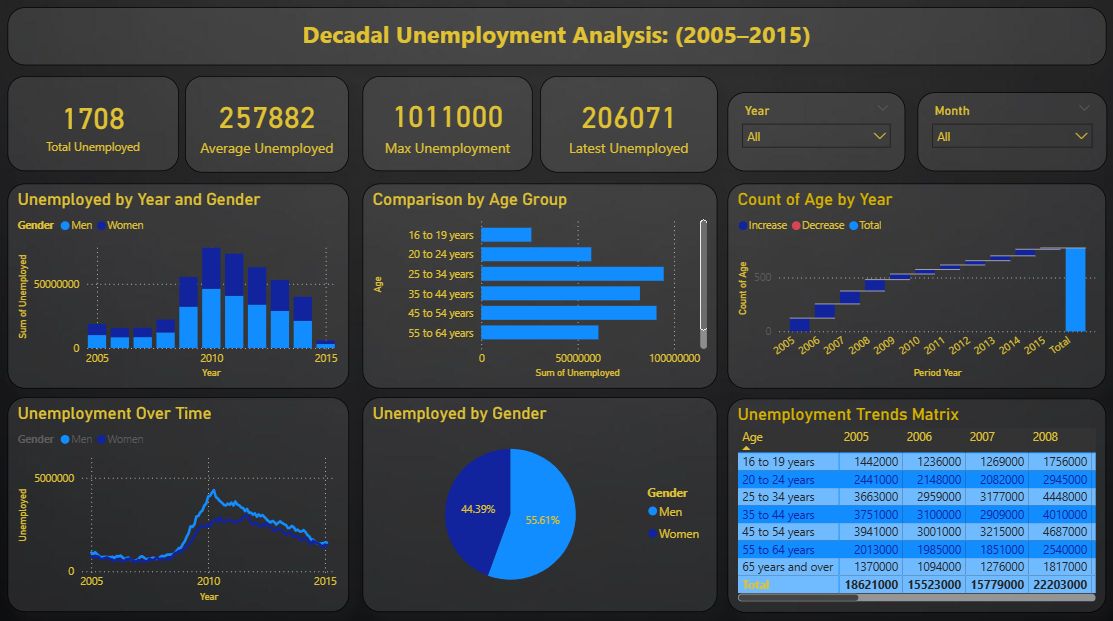 Analyse workforce trends with this Unemployment Analysis Power BI dashboard template designed to track unemployment patterns over time. This Unemployment Analysis Power BI dashboard template highlights key metrics such as total unemployed population, average unemployment levels, maximum unemployment figures, and latest reported values. It also tracks unemployment distribution by gender, age groups, and yearly trends to provide deeper labour market insights. This Unemployment Analysis Power BI dashboard template is ideal for economists, researchers, government agencies, and analysts who need to monitor employment trends and evaluate workforce conditions. It helps identify demographic disparities, understand long-term patterns, and support data-driven policy decisions. The dashboard includes stacked column charts for gender-wise analysis, line charts for trend visualization, bar charts for age group comparisons, waterfall charts for yearly changes, and pie charts for gender distribution. Interactive slicers for year and month enable flexible exploration of data. Download this Unemployment Analysis Power BI dashboard template and start tracking workforce trends and unemployment insights effectively.