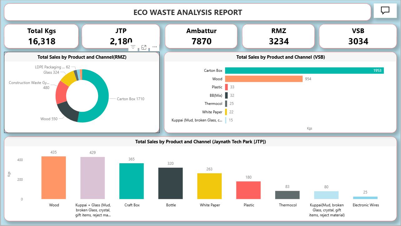 The Waste Management Power BI Dashboard Template helps analyze waste generation, distribution, and composition across multiple locations. This Waste Management Power BI Dashboard Template includes key metrics such as total waste generated, waste by product type, and location-wise distribution to evaluate sustainability performance effectively. It also highlights waste categories such as carton boxes, wood, plastic, glass, paper, thermocol, and electronic waste. Designed for sustainability teams, facility managers, and environmental analysts, this Waste Management Power BI Dashboard Template helps identify major waste contributors, optimize recycling strategies, and improve waste management planning. It solves challenges related to tracking waste patterns and comparing environmental performance across sites. The dashboard includes visuals such as waste distribution charts, location comparison graphs, category breakdown visuals, and KPI cards for quick insights. Interactive filters allow users to explore data by location and waste type for deeper analysis. Download this Waste Management Power BI Dashboard Template and start analysing waste generation and sustainability trends today.