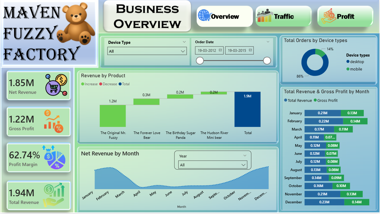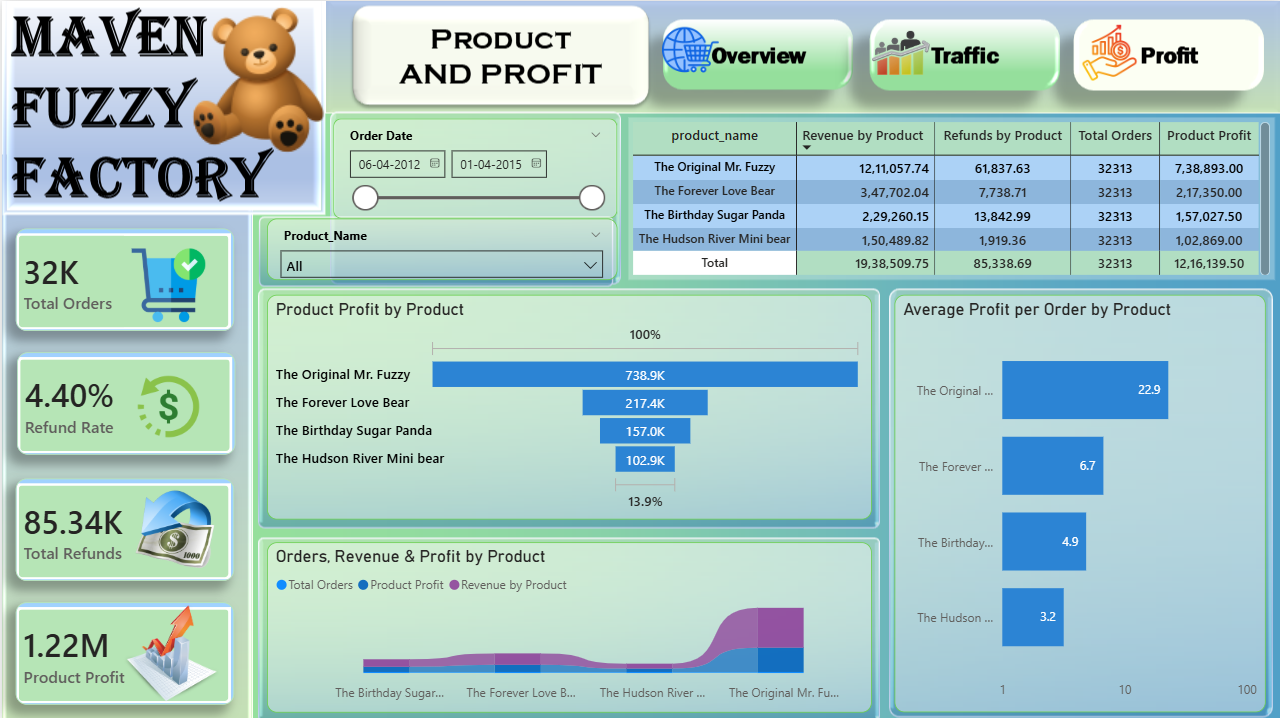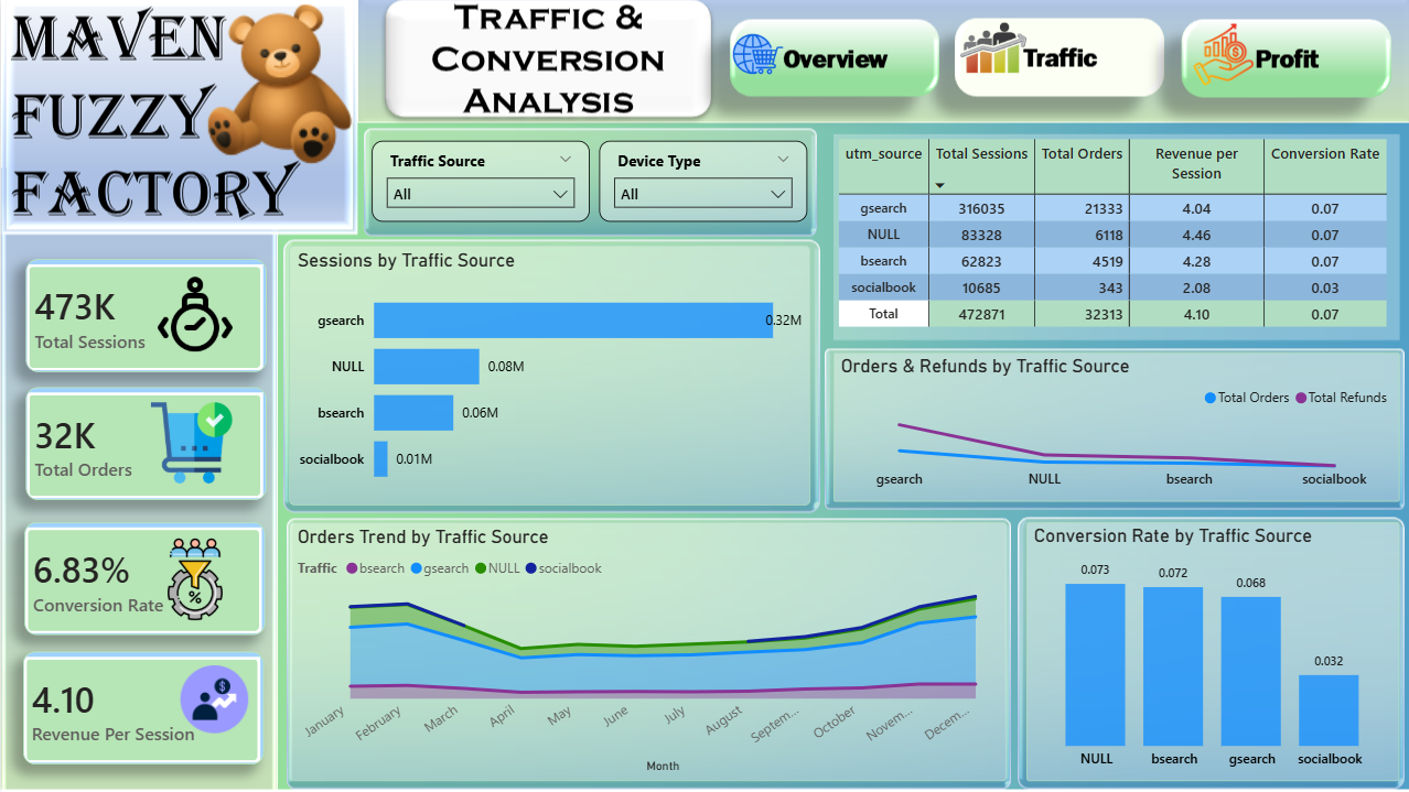 The Ecommerce Business Power BI Dashboard Template helps analyze business performance, product profitability, and customer traffic trends for Maven Fuzzy Factory. This Ecommerce Business Power BI Dashboard Template includes key metrics such as total orders, revenue, gross profit, refund rate, conversion rate, sessions, and profit margin to track overall performance. It also highlights product-level insights, traffic source performance, device-based analysis, and monthly trends. Designed for ecommerce managers, analysts, and marketing teams, this Ecommerce Business Power BI Dashboard Template helps identify top-performing products, optimize marketing channels, and improve conversion rates. It solves challenges related to scattered sales and traffic data while providing clear visibility into business growth. The dashboard includes visuals such as bar charts, line charts, area charts, donut charts, waterfall charts, and detailed tables for performance tracking. Interactive filters allow users to explore data by date, product, traffic source, device type, and year. Download this Ecommerce Business Power BI Dashboard Template and start analysing your business performance and conversion trends today.