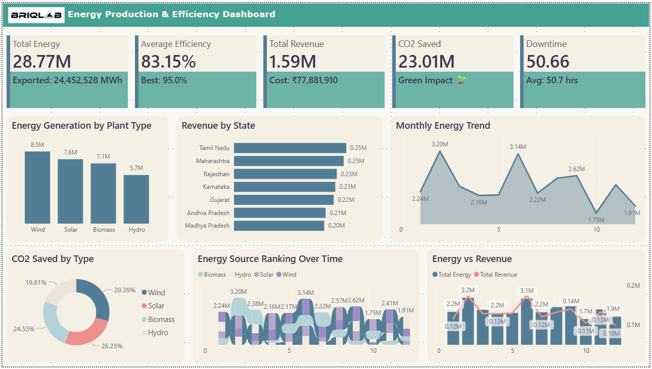 The Energy Production & Efficiency Dashboard provides a comprehensive view of energy generation, operational efficiency, revenue performance, and environmental impact across multiple energy sources and regions. It enables organizations to monitor power production and optimize energy utilization while supporting sustainability goals. This dashboard is designed for energy companies, plant managers, sustainability analysts, and government agencies who require data-driven insights to improve energy efficiency, maximize revenue, and promote environmentally responsible energy production.