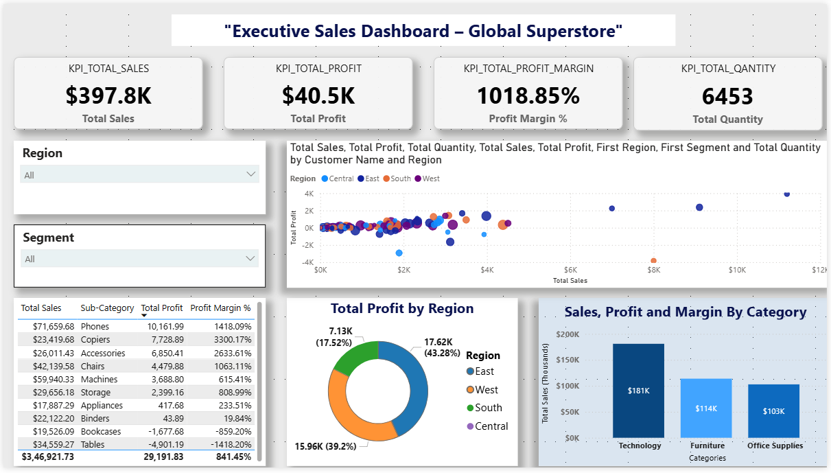 The Executive Sales Power BI Dashboard Template helps businesses track sales performance, profitability, and customer trends across regions and product categories. This Executive Sales Power BI Dashboard Template includes key metrics such as total sales, total profit, profit margin, and total quantity to evaluate business performance effectively. It also highlights customer segmentation, regional sales distribution, and category-wise performance across technology, furniture, and office supplies. Designed for executives, sales managers, and business analysts, this Executive Sales Power BI Dashboard Template helps identify high-performing regions, top customers, and areas with declining profitability. It solves challenges related to tracking revenue growth, understanding customer behavior, and improving strategic decision-making. The dashboard features visuals such as profit by region charts, customer-level sales analysis, category comparison bar charts, and KPI cards for quick insights. Interactive filters allow users to explore data by region and segment for deeper analysis. Download this Executive Sales Power BI Dashboard Template and start analysing your sales performance and profitability trends today.
