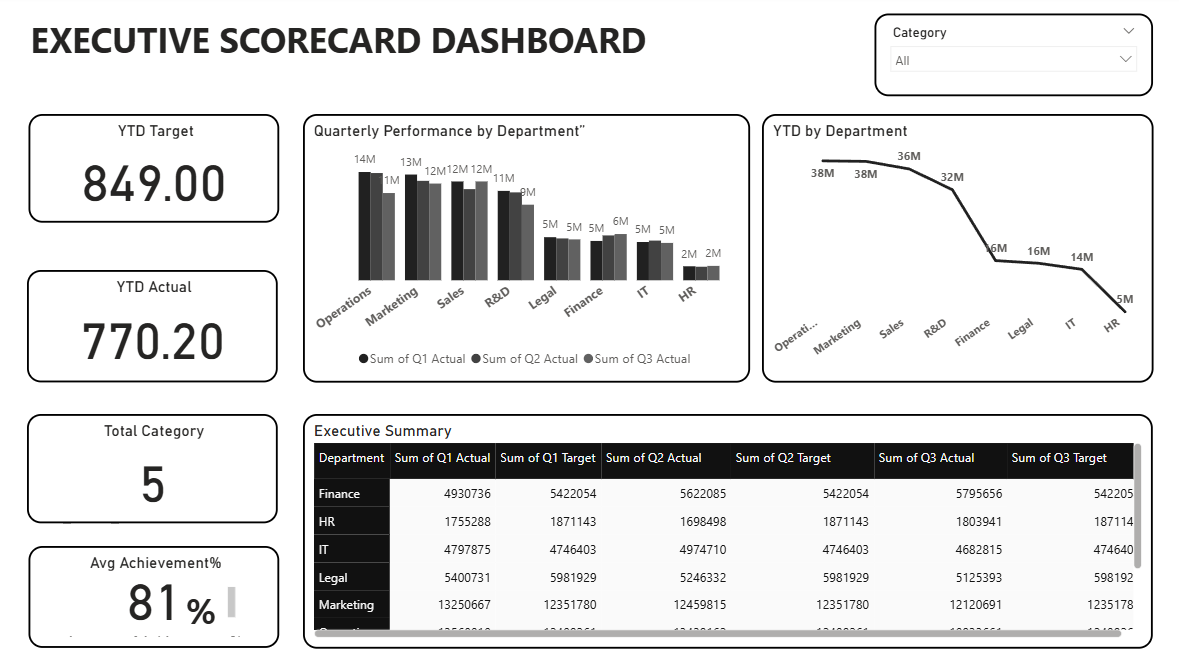 Give your leadership team the visibility they need with this comprehensive Executive Scorecard Power BI dashboard template. Built for CEOs, COOs, Board Members and Strategy teams who need a single-page view of company performance across all strategic dimensions. This free Power BI executive dashboard template brings together financial KPIs, customer metrics, people analytics and market indicators — all in one boardroom-ready PBIX file covering 12 months of company performance data. Key metrics covered: - Revenue, profit margin and EBITDA with YTD achievement - Employee engagement and attrition rate - Market share growth and competitive position - Departmental target achievement by quarter - KPI traffic light system: on track, at risk, behind - Year-over-year growth comparisons - Rolling 12-month trend for every strategic KPI - Variance analysis: actual vs target vs prior year Who uses this dashboard: CEOs reviewing company performance for board meetings. COOs monitoring operational KPIs weekly. Strategy teams tracking OKR and balanced scorecard metrics. Board Members reviewing quarterly and annual performance. Industries: All industries — this dashboard is designed to be industry-agnostic and adaptable to any company's strategic KPI framework. How to use this Executive Scorecard Power BI dashboard: 1. Download the PBIX file from Briqlab 2. Open in Power BI Desktop 3. Replace the 10 sample KPIs with your company's actual strategic metrics 4. Connect data sources: ERP, CRM, HRIS, Marketing and Finance systems 5. Publish to Power BI Service — schedule daily refresh for live board dashboard