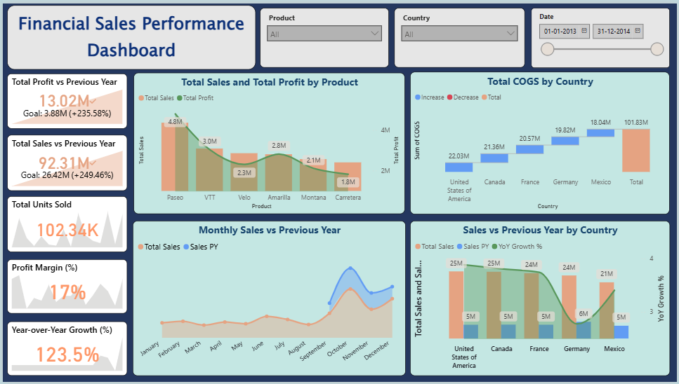Analyse and present your organisation's complete financial picture with this Financial Sales Performance Power BI dashboard template, built to give finance teams, sales leaders, and executives a structured, interactive view of revenue health, profitability, and growth trends in one place. The dashboard tracks all critical financial KPIs including total sales, total profit, units sold, profit margin, and year-over-year growth — with direct benchmarking against previous year performance to surface trends and flag areas of concern instantly. Additional metrics cover product-level revenue contribution, cost of goods sold analysis by country, and monthly sales trend patterns, helping finance and strategy teams pinpoint exactly where margin is being made or lost across markets and product lines. This template is designed for CFOs, financial analysts, sales directors, and business leaders who need a reliable, presentation-ready tool for executive reviews, board reporting, and strategic performance discussions. Visuals include KPI summary scorecards, product contribution bar charts, country-wise COGS comparison tables, YoY growth trend lines, and monthly sales pattern charts — all featuring dynamic slicers for product, country, and date range to enable precise, drill-down analysis. Everything is built natively in Power BI Desktop with no external tools or plugins required. Download this Financial Sales Performance Power BI dashboard template, open the PBIX file in Power BI Desktop, and start tracking your financial performance with clarity today.