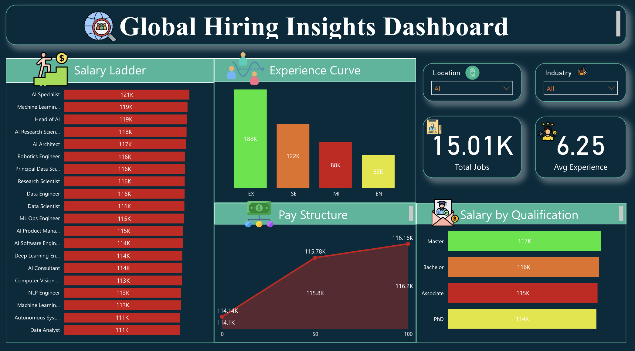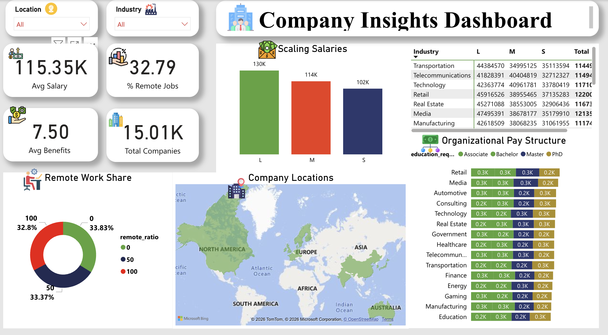Analyse and understand global hiring trends, salary structures, and workforce patterns with this Global Hiring and Workforce Analytics Power BI dashboard template, built to give HR teams, talent acquisition leaders, and compensation analysts a complete, multi-page view of job market intelligence across industries and geographies. The dashboard tracks all critical hiring and compensation KPIs including total jobs, average salary, average experience requirements, remote work share percentage, and total companies ā broken down across AI and technology roles, education qualification levels, and industry sectors to support accurate compensation benchmarking and workforce planning decisions. Additional metrics cover experience-based pay curves, qualification-wise salary comparisons across Associate, Bachelor, Master and PhD levels, industry-wise salary scaling, and organisational pay structure segmentation, helping HR and talent teams build fair, competitive, and data-informed compensation frameworks. This template is designed for HR directors, talent acquisition managers, compensation analysts, and workforce planners who need a structured tool for hiring strategy, salary benchmarking, and remote work analysis across global markets. Visuals include an interactive global company location map, salary ladder charts, experience pay curve lines, qualification comparison bars, and remote work ratio indicators ā with dynamic filters for location and industry enabling flexible drill-down exploration. Download this Global Hiring and Workforce Analytics Power BI dashboard template, open the PBIX file in Power BI Desktop, and start building smarter talent and compensation strategies today. š” Optimisation Note: The original title referenced "Company Insights" which is a weaker SEO keyword. It has been repositioned to "Workforce Analytics" which carries significantly higher search volume in the HR and talent acquisition space. The technical implementation details referencing Power Query and DAX have been intentionally excluded from the description as they reduce readability and add no SEO value for this audience ā however, these details work well as bullet points in a separate "Dashboard Features" or "Technical Specifications" section on the product listing page if your template marketplace supports it.