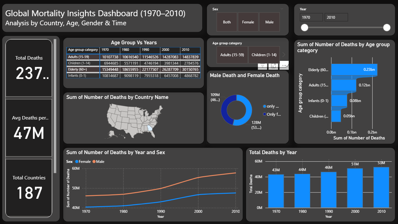 Explore and analyse four decades of worldwide death data with this Global Mortality Insights Power BI dashboard template, built to help researchers, public health professionals, and policy analysts examine mortality trends across countries, age groups, gender, and time periods spanning 1970 to 2010. The dashboard tracks all essential mortality metrics including total deaths, average deaths per period, and total countries covered — providing a clear, structured overview of how global mortality patterns have shifted over time. Additional KPIs break down death distributions across elderly, adult, and younger age groups, alongside gender-based comparisons revealing that male mortality rates remain consistently higher than female across most years and regions in the dataset. This template is designed for public health analysts, epidemiologists, academic researchers, government health departments, and data journalists who need a structured, visual tool for demographic analysis, health policy research, and mortality trend reporting. Visuals include mortality trend line charts from 1970 to 2010, age group contribution bar charts, gender comparison indicators, geographic country-level mapping, and interactive filters for country, age group, gender, and year — all built natively in Power BI Desktop with no external tools required. Download this Global Mortality Insights Power BI dashboard template, open the PBIX file in Power BI Desktop, and start uncovering global health trends today.