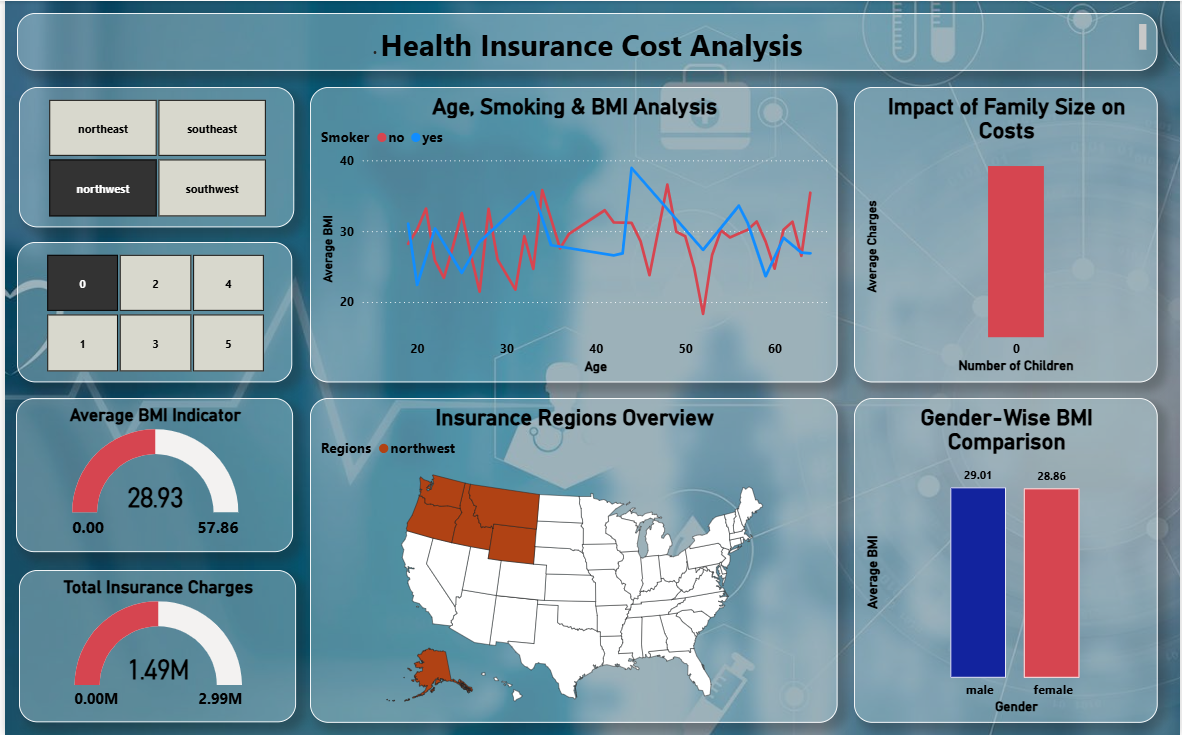 Analyse healthcare expenses with this Health Insurance Cost Analysis Power BI dashboard template designed to track cost drivers and risk factors. This Health Insurance Cost Analysis Power BI dashboard template highlights key metrics such as average BMI, total insurance charges, and cost variations based on age, smoking status, gender, and family size. It also enables users to explore how lifestyle and demographic factors influence insurance pricing and overall healthcare costs. This Health Insurance Cost Analysis Power BI dashboard template is ideal for insurance analysts, healthcare professionals, and policy planners who need to evaluate risk profiles and pricing strategies. It helps identify high-risk groups, understand cost patterns, and support better decision-making in insurance planning. The dashboard includes scatter plots for BMI and charges analysis, bar charts for age and gender comparisons, regional distribution visuals, and KPI cards for quick insights. Interactive filters for region and family size allow flexible and detailed data exploration. Download this Health Insurance Cost Analysis Power BI dashboard template and start analysing insurance cost drivers and risk patterns effectively.