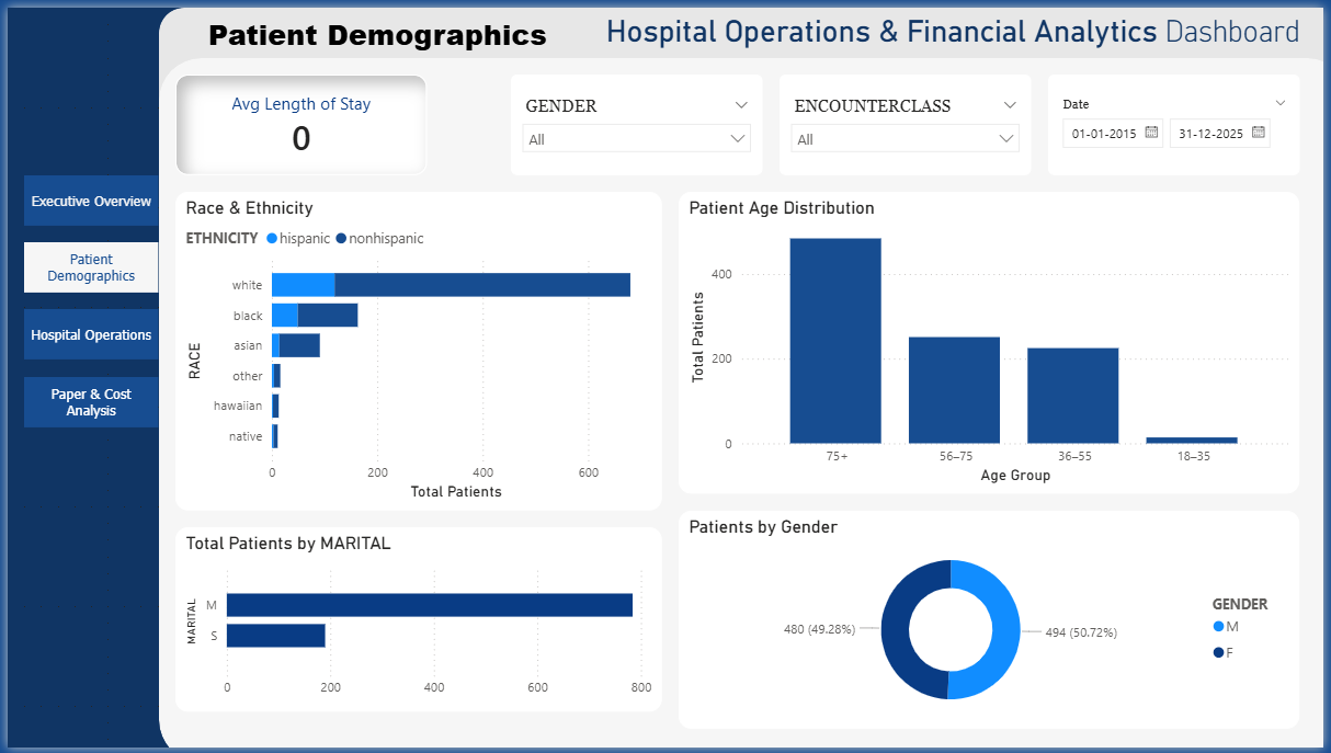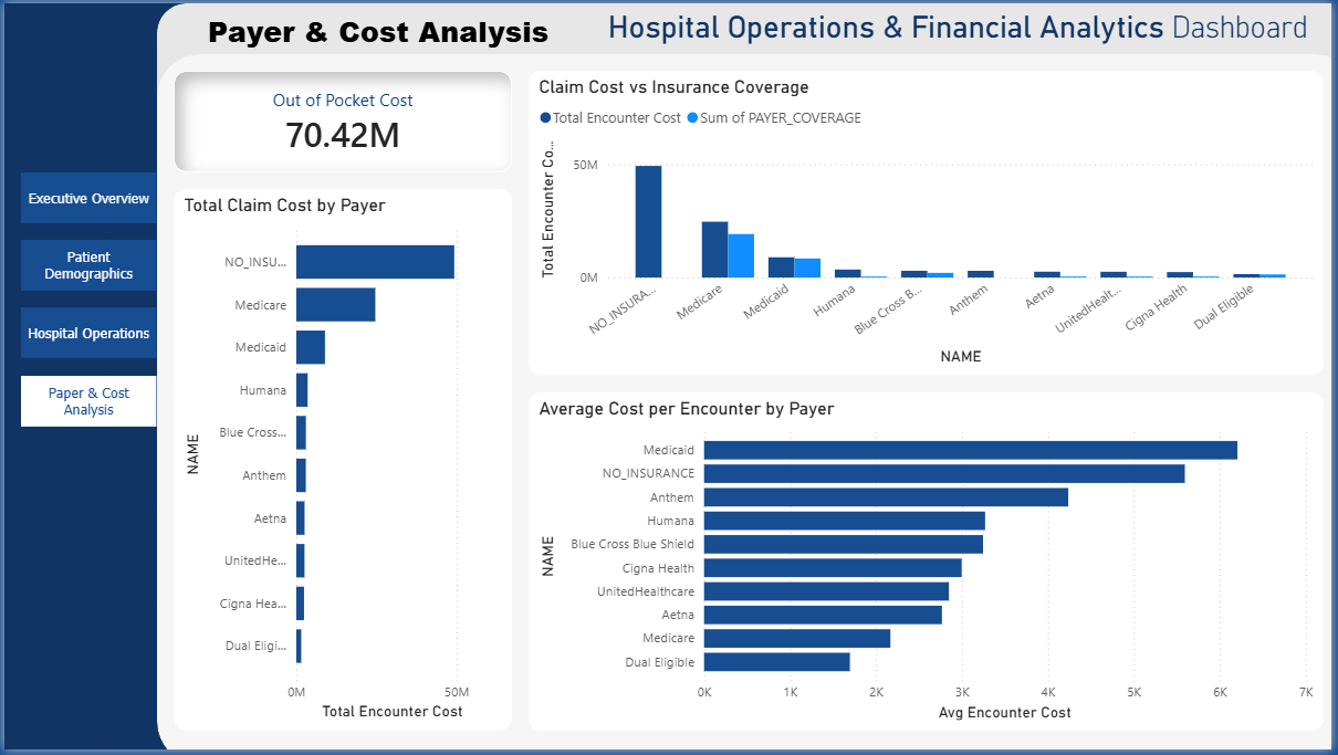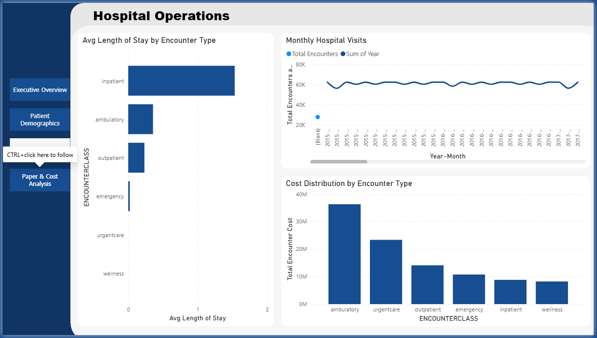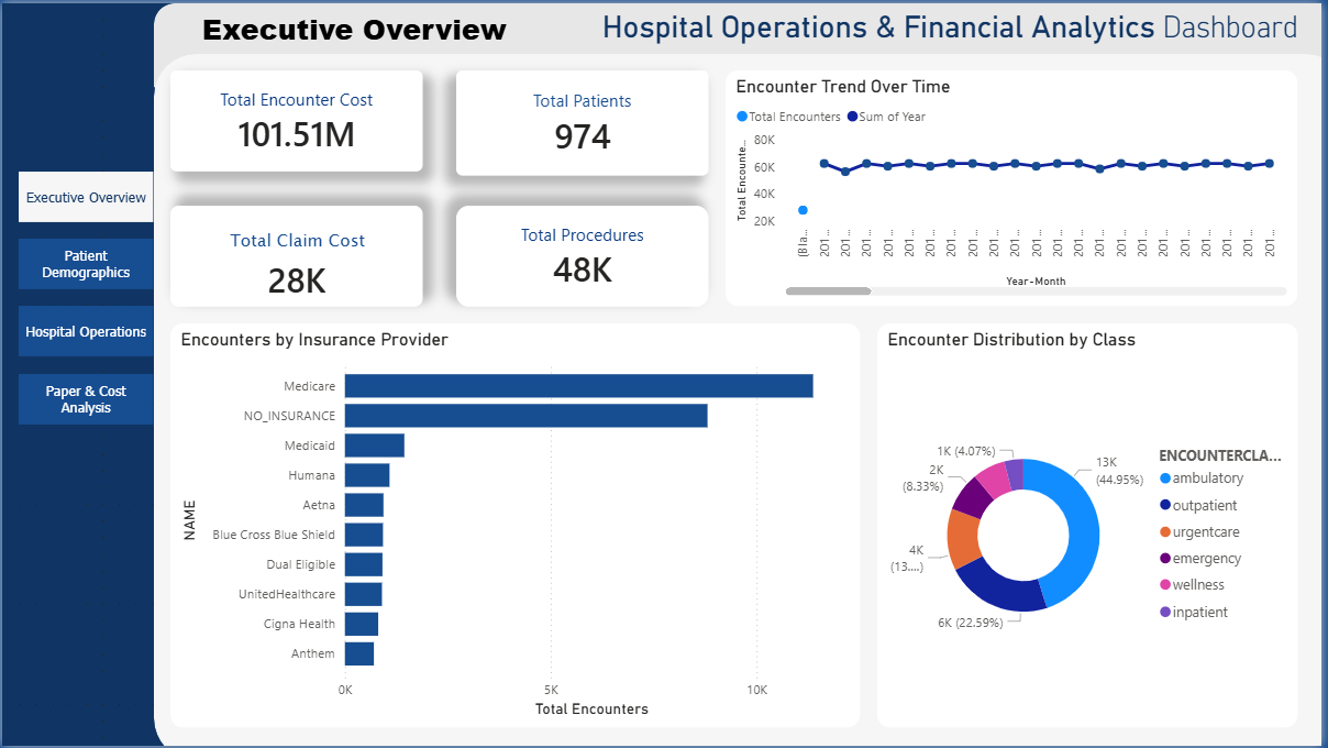 The Healthcare Operations Power BI Dashboard Template helps hospitals track patient demographics, operational efficiency, and financial performance in one unified view. This Healthcare Operations Power BI Dashboard Template includes key metrics such as total encounter cost, claim cost, average length of stay, monthly patient encounters, and payer-wise cost distribution. It also provides insights into patient segmentation, insurance utilization, and clinical performance indicators. Designed for hospital administrators, healthcare analysts, and finance teams, this Healthcare Operations Power BI Dashboard Template helps identify cost drivers, monitor hospital performance, and improve patient care outcomes. It addresses challenges related to fragmented healthcare data, inefficient reporting, and lack of visibility into operational trends. The dashboard includes visuals such as patient demographic breakdown charts, monthly encounter trends, cost analysis by payer, and KPI cards for quick performance tracking. Interactive filters and drill-down features allow users to explore data across departments, time periods, and patient groups. Download this Healthcare Operations Power BI Dashboard Template and start improving hospital performance and financial decision-making today.