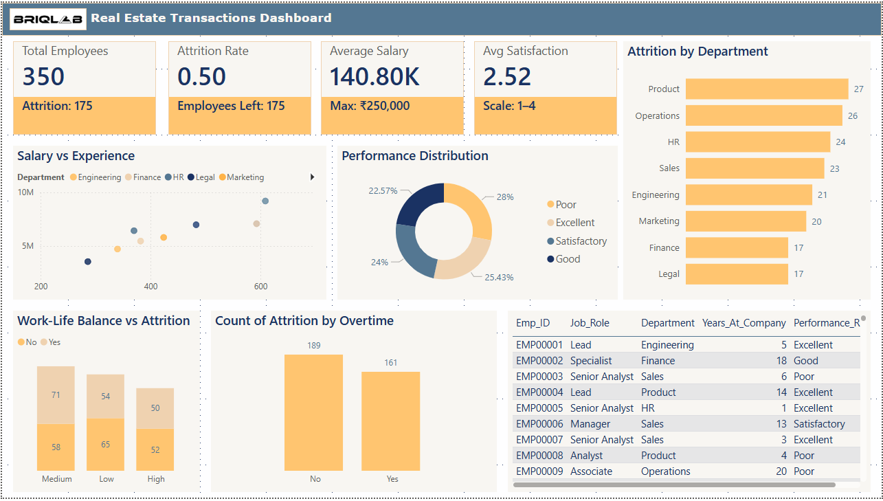 The HR Analytics Dashboard provides a comprehensive view of employee performance, attrition trends, salary distribution, and workforce satisfaction across departments. It helps organizations understand key workforce dynamics and make data-driven decisions to improve employee retention and productivity. Additionally, the dashboard examines work-life balance and overtime impact on attrition, helping HR teams understand how employee workload influences retention. The Performance Distribution provides insights into employee performance levels, while detailed employee data allows deeper investigation. This dashboard is designed for HR managers, business leaders, and talent analysts who need actionable insights to reduce attrition, improve employee satisfaction, and optimize workforce planning.