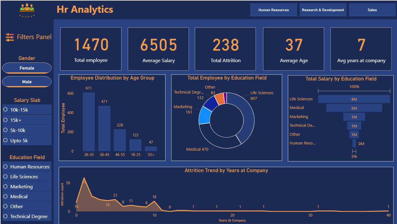 The HR Analytics Power BI Dashboard Template helps analyze workforce demographics, salary distribution, and attrition trends across employees. This HR Analytics Power BI Dashboard Template includes key metrics such as employee count by age group, salary contribution by education field, and attrition trends by years at the company to evaluate workforce performance effectively. It also highlights employee distribution across education domains and salary slabs for deeper insights. Designed for HR managers, recruiters, and people analytics teams, this HR Analytics Power BI Dashboard Template helps identify attrition patterns, optimize hiring strategies, and improve workforce planning. It solves challenges related to understanding employee behavior and managing HR data efficiently. The dashboard includes visuals such as age group distribution charts, education-wise salary analysis, attrition trend graphs, and KPI cards for quick insights. Interactive filters allow users to explore data by gender, salary slab, and education field for detailed analysis. Download this HR Analytics Power BI Dashboard Template and start analysing workforce performance and attrition trends today.