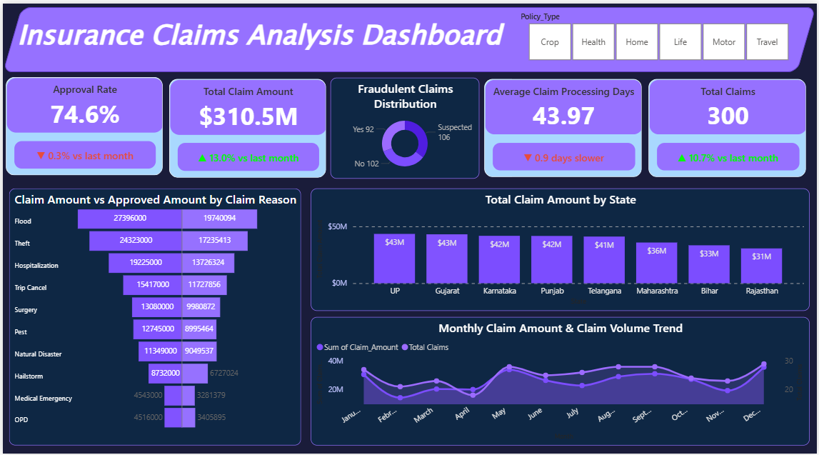 This dashboard provides a comprehensive analysis of insurance claims, highlighting key metrics such as approval rate, total claim amount, processing time, and claim volume. It enables users to monitor fraudulent claim distribution, compare approved versus total claim amounts by reason, and evaluate state-wise claim performance. The inclusion of monthly trends supports tracking claim patterns and operational efficiency over time. Overall, it offers actionable insights to improve claim management and decision-making processes.