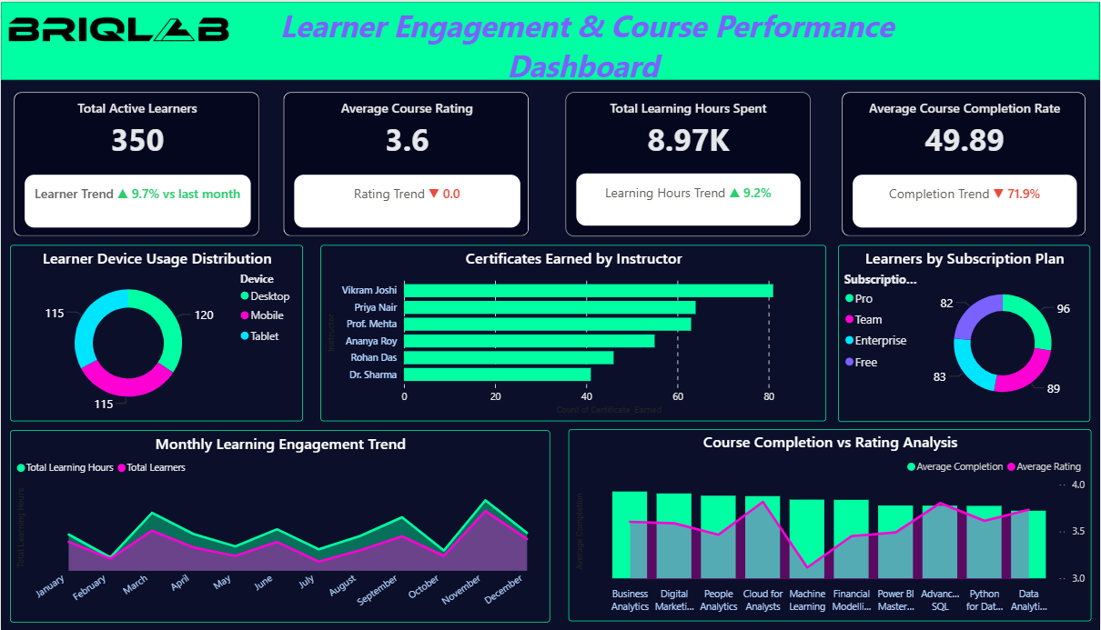 This dashboard provides a comprehensive overview of learner engagement and course performance within an online learning platform. It highlights key metrics such as total active learners, average course ratings, total learning hours, and course completion rates to evaluate overall learning effectiveness. The visualizations analyze learner device usage, subscription plan distribution, instructor performance through certificates earned, and monthly engagement trends.