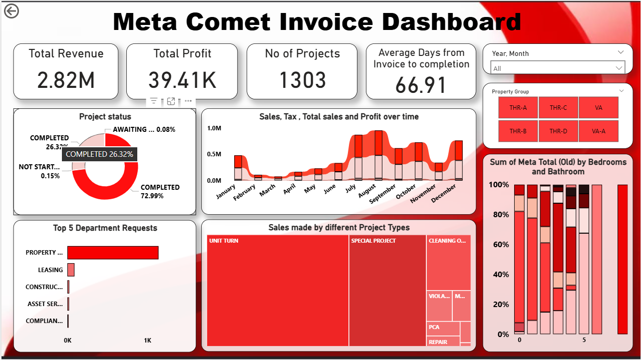 The Project Invoicing Power BI Dashboard Template helps track project revenue, profit, invoice timelines, and overall project performance in one place. This Project Invoicing Power BI Dashboard Template includes key metrics such as total revenue, total profit, project volume, invoice completion timelines, and project status to evaluate financial performance effectively. It also highlights monthly trends in sales, tax, and profit along with revenue contribution across project types and property configurations. Designed for finance teams, project managers, and business analysts, this Project Invoicing Power BI Dashboard Template helps monitor billing efficiency, identify high-performing projects, and improve financial planning. It solves challenges related to tracking invoicing performance and understanding revenue distribution across departments. The dashboard includes visuals such as monthly trend charts, revenue breakdown graphs, departmental performance charts, and KPI cards for quick insights. Interactive filters allow users to explore data by project type, department, and time period for deeper analysis. Download this Project Invoicing Power BI Dashboard Template and start analysing your revenue, profit, and invoicing performance today.
