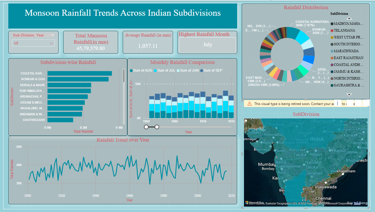 The Monsoon Rainfall Power BI Dashboard Template helps analyze rainfall patterns across Indian subdivisions and track seasonal climate trends over time. This Monsoon Rainfall Power BI Dashboard Template includes key metrics such as total monsoon rainfall, average rainfall levels, and highest rainfall month to evaluate seasonal performance effectively. It also highlights subdivision-wise comparisons, monthly rainfall distribution, and long-term trends to identify climate variability and anomalies. Designed for climate researchers, agricultural planners, and environmental analysts, this Monsoon Rainfall Power BI Dashboard Template helps understand regional rainfall differences, support crop planning, and improve disaster preparedness. It addresses challenges related to scattered climate data and difficulty in identifying rainfall trends across regions. The dashboard includes visuals such as rainfall distribution charts, subdivision comparison graphs, monthly trend analysis, and an interactive geographical map of India. Time-based filters allow users to explore historical patterns and seasonal variations in detail. Download this Monsoon Rainfall Power BI Dashboard Template and start analysing rainfall trends and climate patterns today.