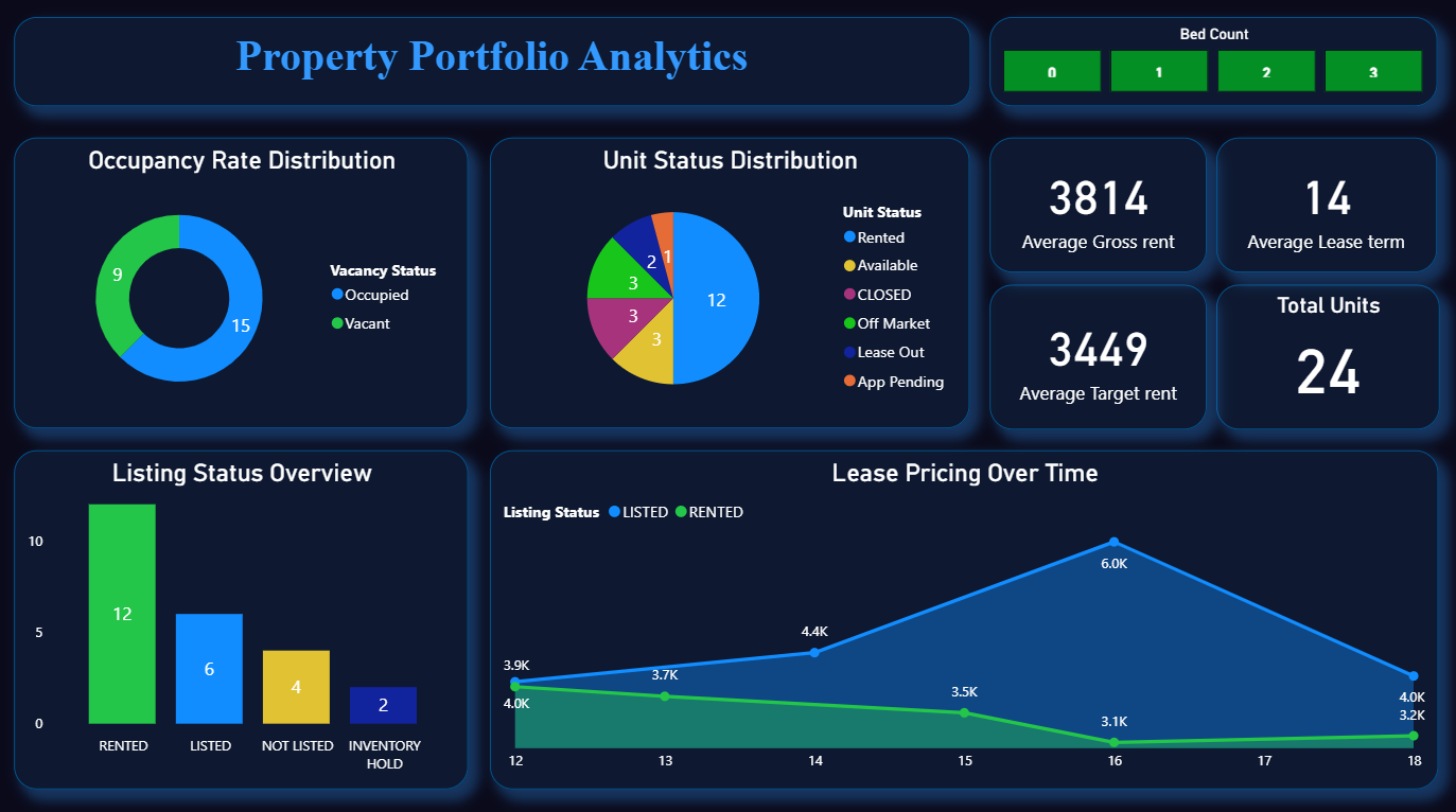 The Property Analytics Power BI Dashboard Template helps analyze rental performance, occupancy status, and unit availability across residential properties. This Property Analytics Power BI Dashboard Template includes key metrics such as average gross rent, target rent, lease term, and total units to evaluate portfolio performance effectively. It also highlights occupancy distribution, unit status breakdown, and listing activity across properties. Designed for property managers, leasing teams, and real estate analysts, this Property Analytics Power BI Dashboard Template helps identify vacancies, monitor rental trends, and optimize pricing strategies. It solves challenges related to tracking property performance and understanding occupancy patterns across units. The dashboard includes visuals such as rental trend charts, occupancy distribution graphs, listing status visuals, and KPI cards for quick insights. Interactive filters allow users to explore data by property, lease term, and time period for deeper analysis. Download this Property Analytics Power BI Dashboard Template and start analysing rental performance and occupancy trends today.