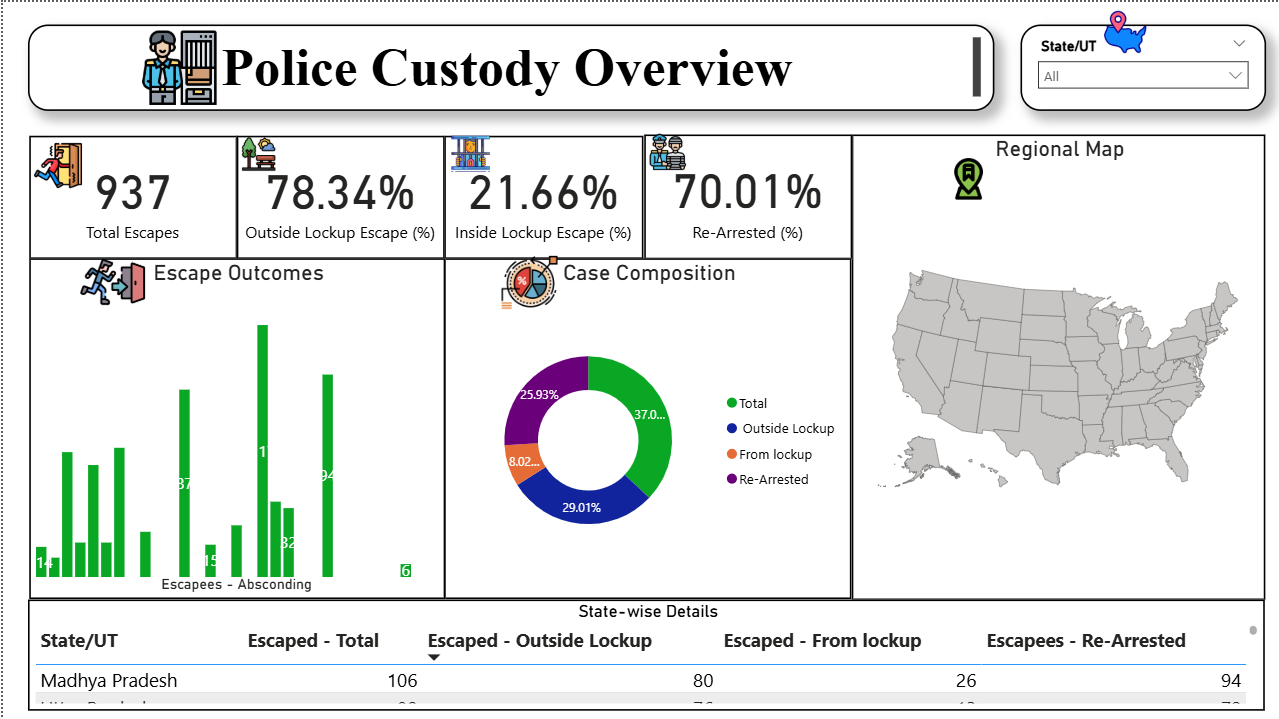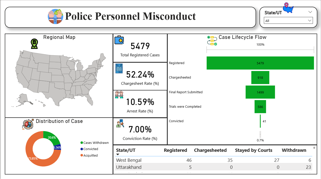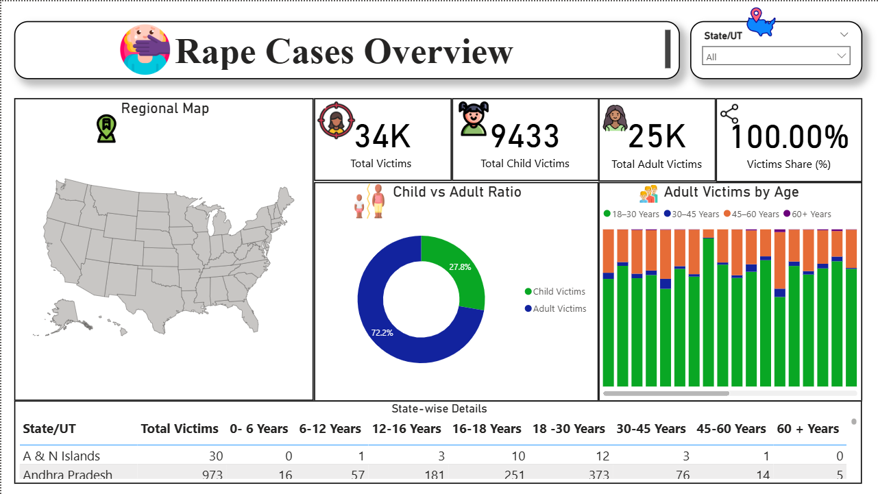 Analyse sensitive crime data with this Rape Cases Analysis Power BI dashboard template designed to track case trends and outcomes. This Rape Cases Analysis Power BI dashboard template highlights key metrics such as total registered cases, conviction rates, arrest rates, escape percentages, re-arrest outcomes, and victim distribution by age and category. It also enables users to examine case progression, demographic patterns, and regional variations over time. This Rape Cases Analysis Power BI dashboard template is ideal for policymakers, law enforcement agencies, and researchers who need to monitor crime patterns and improve public safety strategies. It helps identify high-risk regions, evaluate enforcement effectiveness, and support informed decision-making. The dashboard includes funnel charts for case lifecycle tracking, bar and stacked charts for demographic and state comparisons, donut charts for category distribution, maps for regional analysis, and tables for detailed case-level insights. Interactive filters allow flexible exploration across time, location, and categories. Download this Rape Cases Analysis Power BI dashboard template and start analysing crime trends and safety insights effectively.