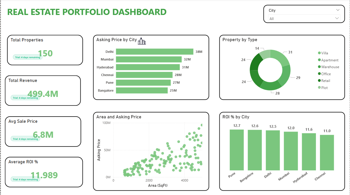 Manage your property portfolio with confidence using this comprehensive Real Estate Power BI dashboard template. Built for Real Estate Developers, Property Managers, Sales Directors and Real Estate Analysts who need clear visibility into listings, sales performance, agent metrics and market trends. This free Power BI real estate dashboard template covers property portfolio management, sales funnel, agent performance and price analysis — all in one PBIX file with 150 sample property listings across major Indian cities. Key metrics covered: - Total listings by type (Apartment, Villa, Office, Retail, Plot) - Available vs sold vs rented property breakdown - Average days on market by property type and city - Listing price vs market value vs asking price analysis - Revenue by location, property type and agent - Agent performance: listings, conversion rate, days on market - Commission earned and revenue per agent - Customer enquiry to booking conversion funnel - Price per square foot trends by city and zone - ROI analysis by property type and location Who uses this dashboard: Real Estate Developers tracking project sales velocity. Property Management Companies monitoring portfolio health. Sales Directors managing agent team performance. Real Estate Investors analysing portfolio ROI. Industries: Residential Real Estate, Commercial Real Estate, Property Management, Real Estate Consulting, REITs. How to use this Real Estate Power BI dashboard: 1. Download the PBIX file from Briqlab 2. Open in Power BI Desktop 3. Connect to your property data (Excel CRM export, MagicBricks data, NoBroker export) 4. Map property ID, type, location, price and status fields 5. Publish to Power BI Service for sales team visibility