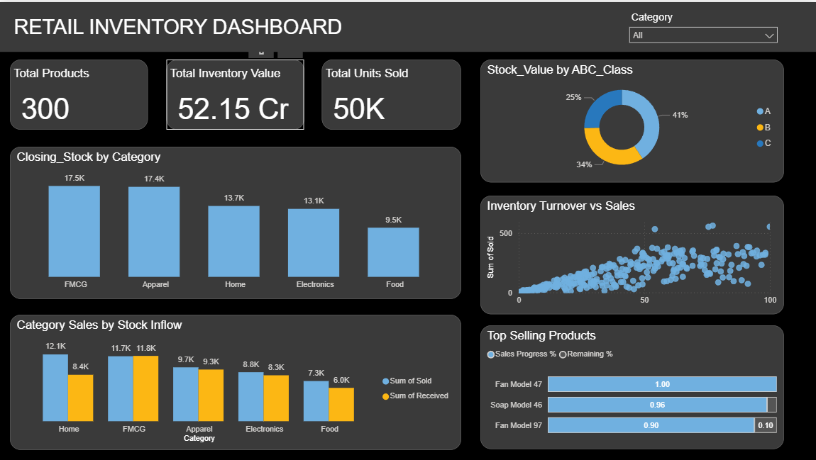 Retail Inventory Power BI Dashboard Template – Free PBIX Download Track and optimise your retail inventory performance with this free Power BI dashboard template. Designed for retail analysts, store managers, and supply chain professionals, this PBIX dashboard provides a complete overview of inventory health across multiple product categories — all in one interactive view. Key metrics at a glance: Total products, total inventory value, and total units sold ABC inventory classification to segment high-value, medium-value, and low-value items Category-wise sales vs. stock inflow analysis Current closing stock levels by category Inventory turnover vs. sales performance relationship Top-selling products visualised with a progress-style chart Who is this Power BI template for? This retail inventory dashboard is ideal for retail businesses, ecommerce operations, and supply chain teams looking to monitor stock levels, reduce overstock or stockouts, and make faster, data-driven inventory decisions using Power BI Desktop. What's included: Ready-to-use .pbix file — open directly in Power BI Desktop Pre-built visuals for inventory KPIs, ABC analysis, and demand tracking Compatible with Microsoft Power BI Desktop (free version) Download this free retail inventory Power BI template and start tracking your inventory performance today.