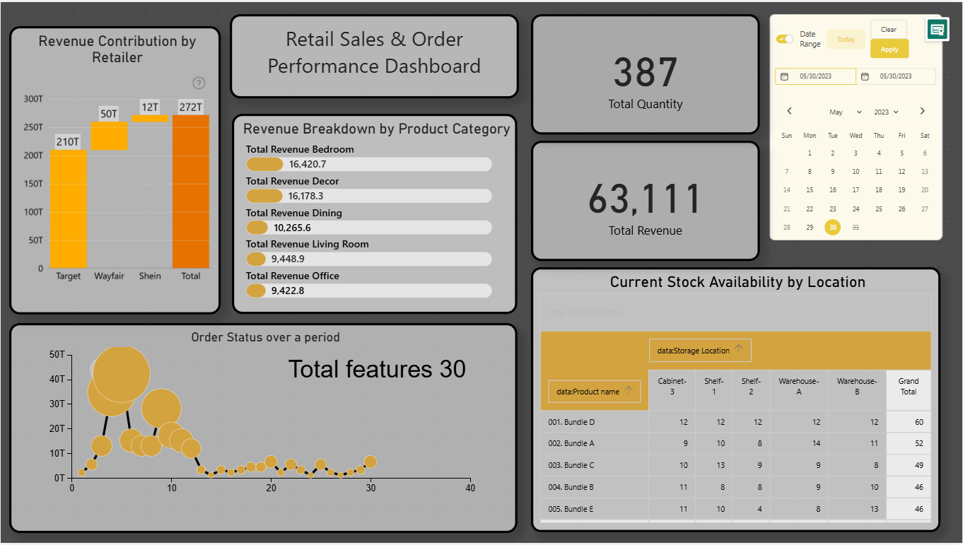 The Retail Order Analytics Power BI Dashboard Template helps track revenue, order performance, and inventory availability across multiple retailers and locations. This Retail Order Analytics Power BI Dashboard Template includes key metrics such as total revenue, total quantity sold, and revenue contribution by retailer to evaluate sales performance effectively. It also highlights product category revenue, order status trends, and stock availability across storage locations. Designed for retail managers, supply chain teams, and business analysts, this Retail Order Analytics Power BI Dashboard Template helps identify demand patterns, optimize inventory management, and improve sales strategies. It solves challenges related to tracking order trends and maintaining inventory visibility across locations. The dashboard includes visuals such as retailer revenue comparison charts, category-level revenue analysis, order trend graphs, and inventory availability visuals. Interactive date range filters allow users to explore time-based insights and analyze performance across different periods. Download this Retail Order Analytics Power BI Dashboard Template and start analysing sales, orders, and inventory performance today.