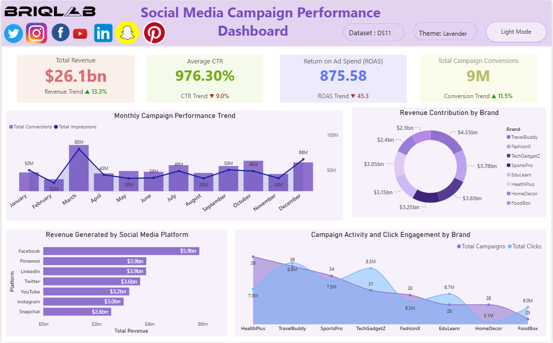 This dashboard provides a comprehensive overview of social media marketing performance by analyzing revenue generation, campaign engagement, advertising efficiency, and brand contribution. It helps marketing teams evaluate campaign success, identify high-performing platforms, and monitor monthly trends in impressions, clicks, and conversions.