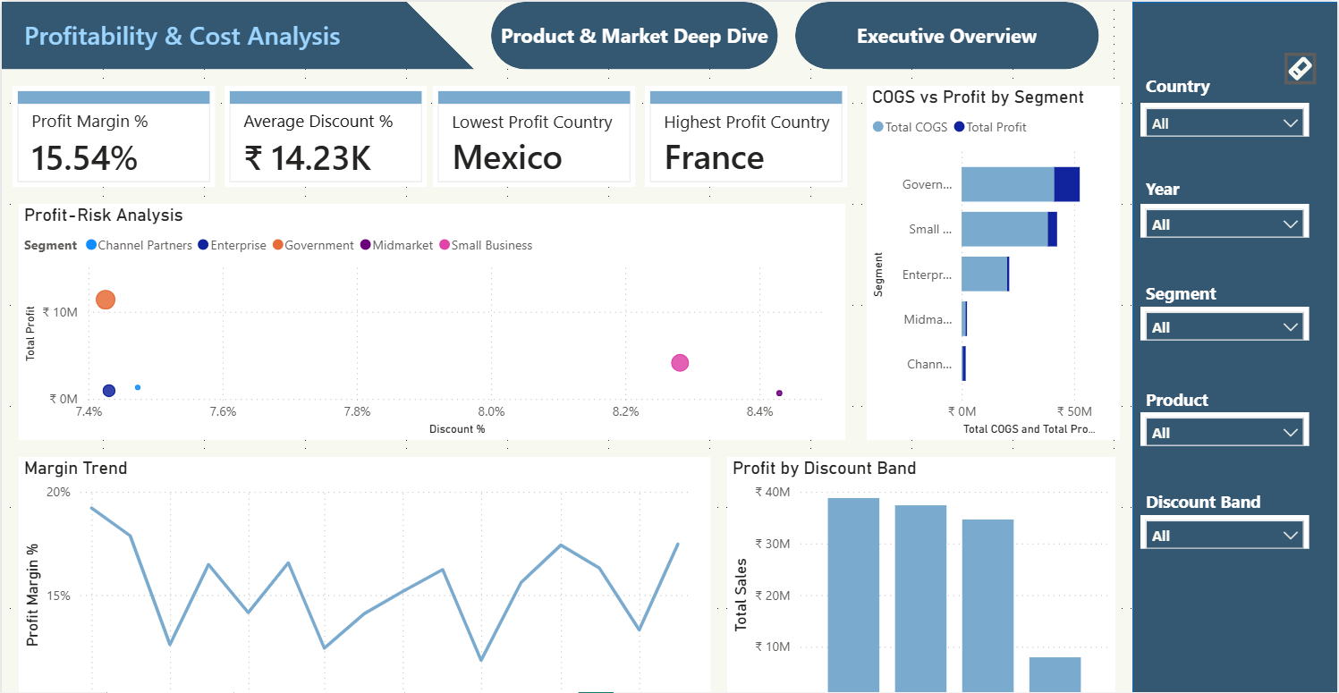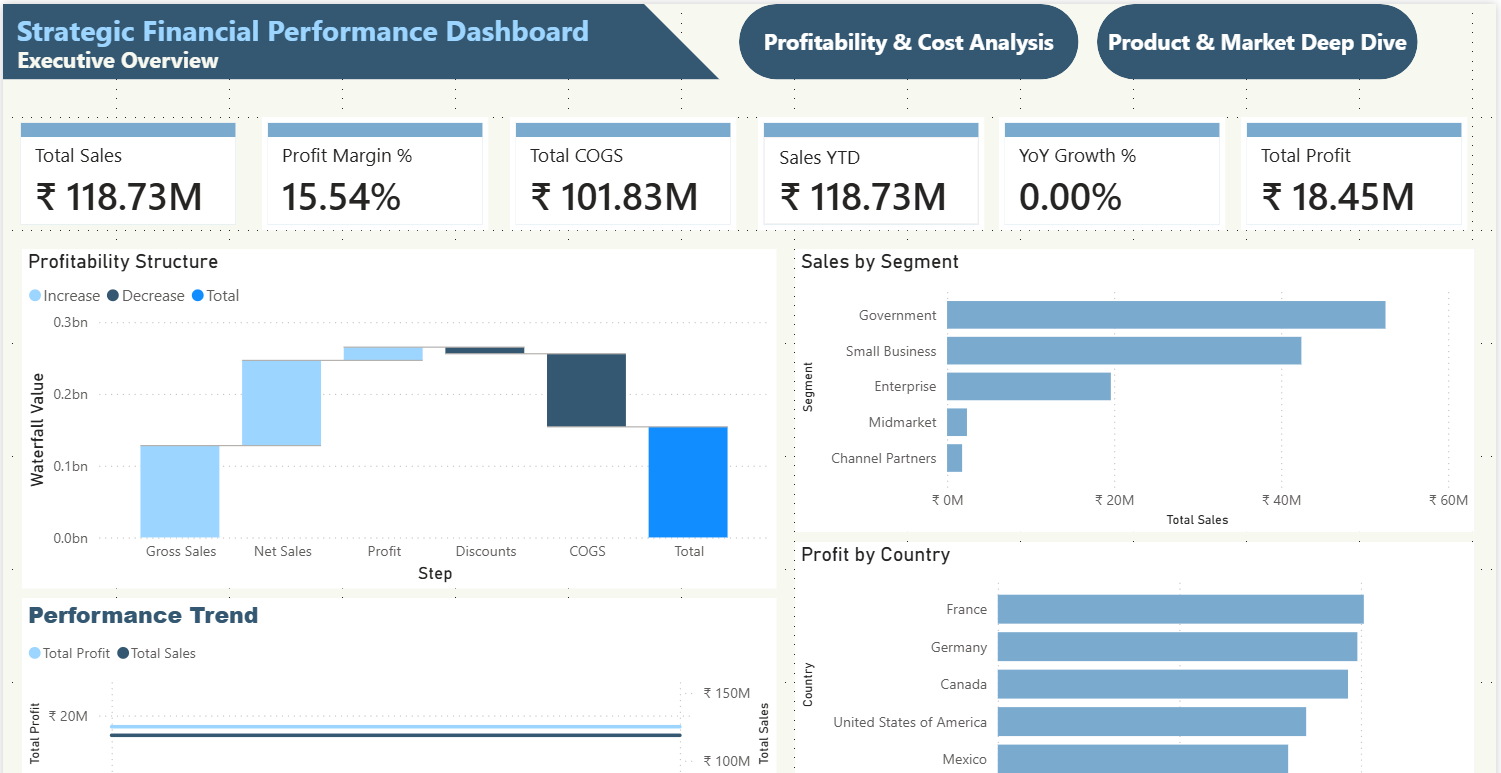 Here is the fully optimised SEO output: ā SEO-Optimised Output New Title: Strategic Financial Performance Power BI Dashboard Template | Free PBIX Download Meta Title (60 characters): Strategic Financial Performance Power BI Dashboard Meta Description (154 characters): Download the Strategic Financial Performance Power BI dashboard template. Track profit margins, YoY growth, COGS and revenue by segment. Free PBIX for Power BI Desktop. URL Slug: strategic-financial-performance-power-bi-dashboard-template H1 Tag: Strategic Financial Performance Power BI Dashboard Template | Free PBIX Download Image Alt Text: Strategic Financial Performance Power BI dashboard template showing profit margin, year-over-year growth, waterfall profitability structure, sales by segment and profit by country Description (196 words): Get a clear, executive-level view of your organisation's financial health with this Strategic Financial Performance Power BI dashboard template, designed to consolidate critical financial KPIs and profitability insights into a single, structured summary for leadership teams. The dashboard tracks all essential financial metrics including total sales, total profit, total COGS, profit margin percentage, sales year-to-date, and year-over-year growth ā delivering an instant financial snapshot that supports fast, confident executive decision-making. Additional KPIs cover segment-level revenue contribution, geographic profit performance by country, and time-based sales and profit trend analysis, helping leadership teams monitor financial stability and identify growth patterns across markets and customer segments. This template is designed for CFOs, financial controllers, senior executives, and strategy teams who need a presentation-ready dashboard for board reviews, leadership meetings, and high-level financial performance discussions. Visuals include a profitability structure waterfall chart breaking down gross sales, discounts, COGS and net profit, segment revenue comparison charts, profit by country bar charts, and performance trend line graphs over time ā all built natively in Power BI Desktop with no external plugins or tools required. Download this Strategic Financial Performance Power BI dashboard template, open the PBIX file in Power BI Desktop, and start presenting your financial strategy with clarity today.