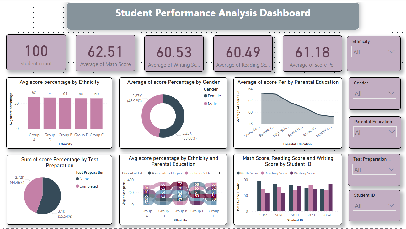Analyse academic outcomes with this Education Student Performance Power BI dashboard template designed to track student scores and learning trends. This Education Student Performance Power BI dashboard template highlights key metrics such as total student count, average math, reading, and writing scores, along with overall performance indicators. It also provides insights into how factors like ethnicity, gender, parental education, and test preparation influence student achievement. This Education Student Performance Power BI dashboard template is ideal for educators, school administrators, and analysts who need to evaluate student performance and identify achievement gaps. It helps institutions improve academic planning, monitor progress, and make informed decisions based on data insights. The dashboard includes comparison charts for demographic groups, subject-wise performance visuals, KPI cards for quick score tracking, and detailed analysis by student. Interactive filters for ethnicity, gender, parental education, test preparation, and individual students enable flexible exploration. Download this Education Student Performance Power BI dashboard template and start tracking academic performance and student insights effectively.