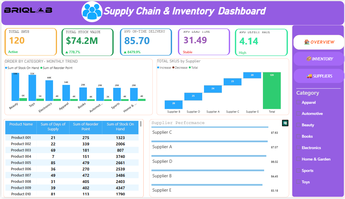 This dashboard provides a comprehensive overview of supply chain and inventory performance, highlighting key metrics such as stock levels, stock value, delivery performance, lead time, and defect rate. It enables analysis of category-wise stock trends, supplier contributions, and product-level inventory details. The inclusion of supplier performance and reorder insights supports efficient inventory management and demand planning. Overall, it delivers actionable insights to optimize supply chain operations and improve decision-making.