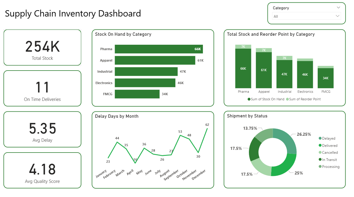 Optimise your supply chain operations with this comprehensive Power BI Supply Chain dashboard template. Built for Supply Chain Managers, Procurement Heads, Warehouse Managers and Operations Directors who need end-to-end visibility into inventory, suppliers and logistics. This free Power BI supply chain dashboard template covers inventory management, supplier performance, shipment tracking and warehouse KPIs — all connected in one interactive PBIX file with 100 SKUs of sample data. Key metrics covered: - Stock on hand vs reorder points by SKU and warehouse - Inventory value and days of supply calculation - ABC classification analysis for inventory optimisation - Supplier on-time delivery, quality score and lead times - Defect rate and price variance by supplier - Shipment tracking by carrier, mode and status - Delivery performance and delay analysis - Purchase order to delivery cycle time - Dead stock and slow-moving inventory identification Who uses this dashboard: Supply Chain Directors monitoring end-to-end supply chain health. Procurement Managers tracking supplier performance KPIs. Warehouse Managers optimising stock levels and replenishment. Operations Analysts building supply chain reporting for leadership. Industries: Manufacturing, Retail, FMCG, Pharma, E-commerce, Automotive, Food & Beverage. How to use this Supply Chain Power BI dashboard: 1. Download the PBIX file from Briqlab 2. Open in Power BI Desktop 3. Connect to your ERP inventory data (SAP, Oracle NetSuite, Dynamics 365, Excel) 4. Map SKU codes, stock quantities, supplier data and shipment records 5. Publish to Power BI Service for operations team access