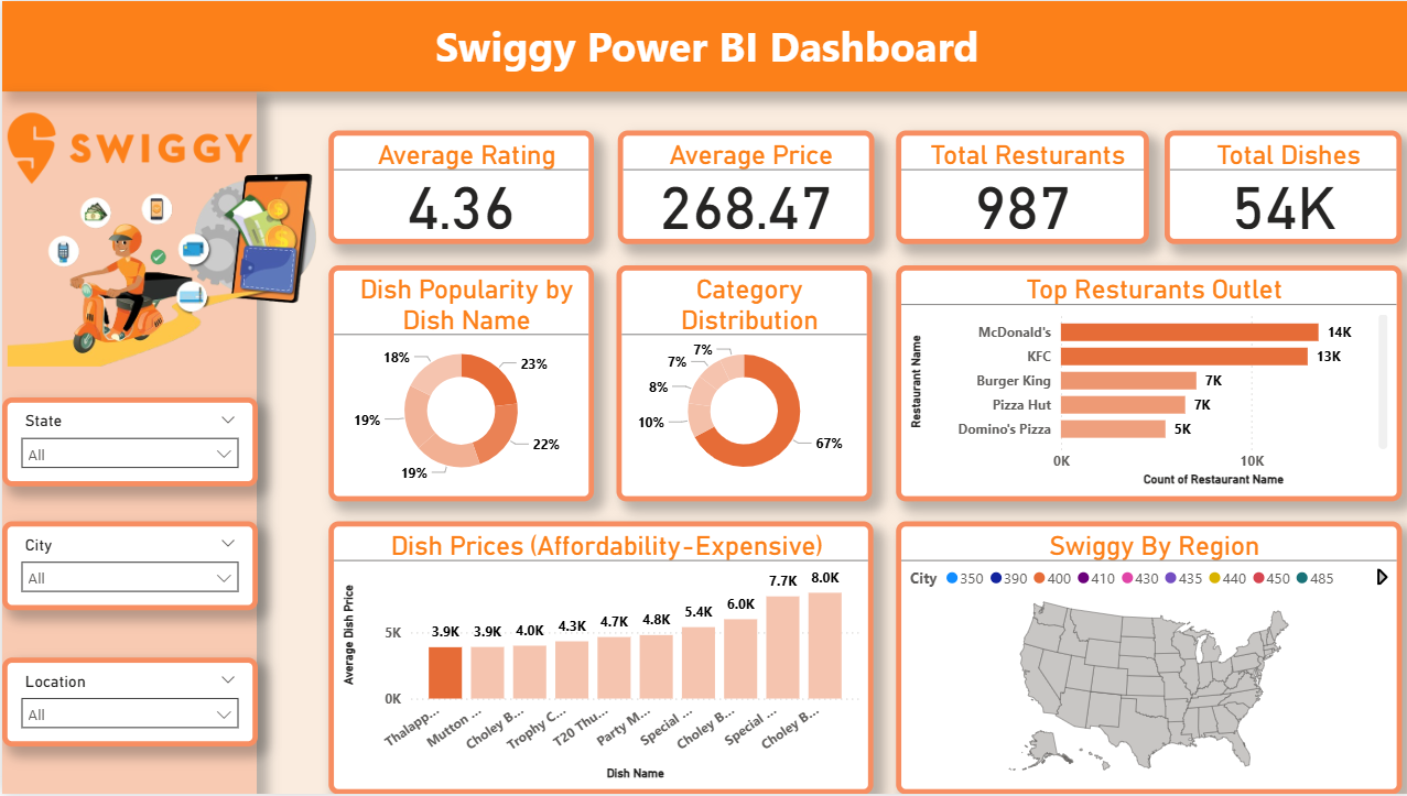 The Food Delivery Analytics Power BI Dashboard Template helps analyze restaurant performance, customer preferences, and pricing trends across locations. This Food Delivery Analytics Power BI Dashboard Template includes key metrics such as average rating, average price, total restaurants, and total dishes to evaluate platform performance effectively. It also highlights dish popularity, category distribution, and top restaurant outlets across different cities. Designed for food delivery platforms, restaurant owners, and business analysts, this Food Delivery Analytics Power BI Dashboard Template helps optimize menu strategies, improve pricing decisions, and identify high-performing locations. It solves challenges related to understanding customer preferences and tracking restaurant performance across regions. The dashboard includes visuals such as dish popularity charts, category distribution graphs, price range analysis, and geographic maps for region-wise insights. Interactive filters allow users to explore data by city, category, and price range for deeper analysis. Download this Food Delivery Analytics Power BI Dashboard Template and start analysing restaurant performance and customer trends today.
