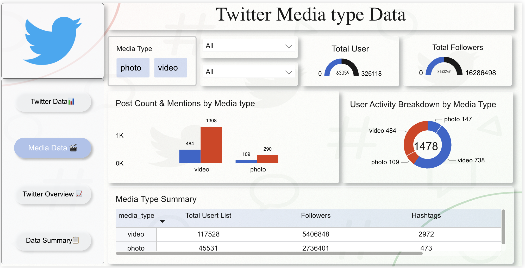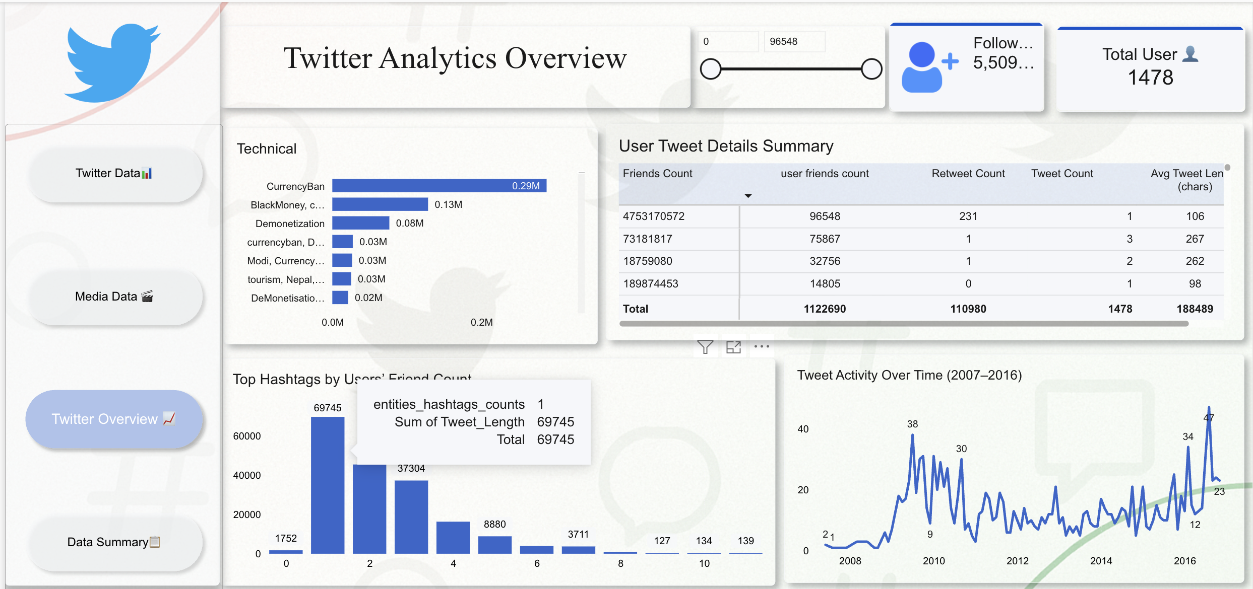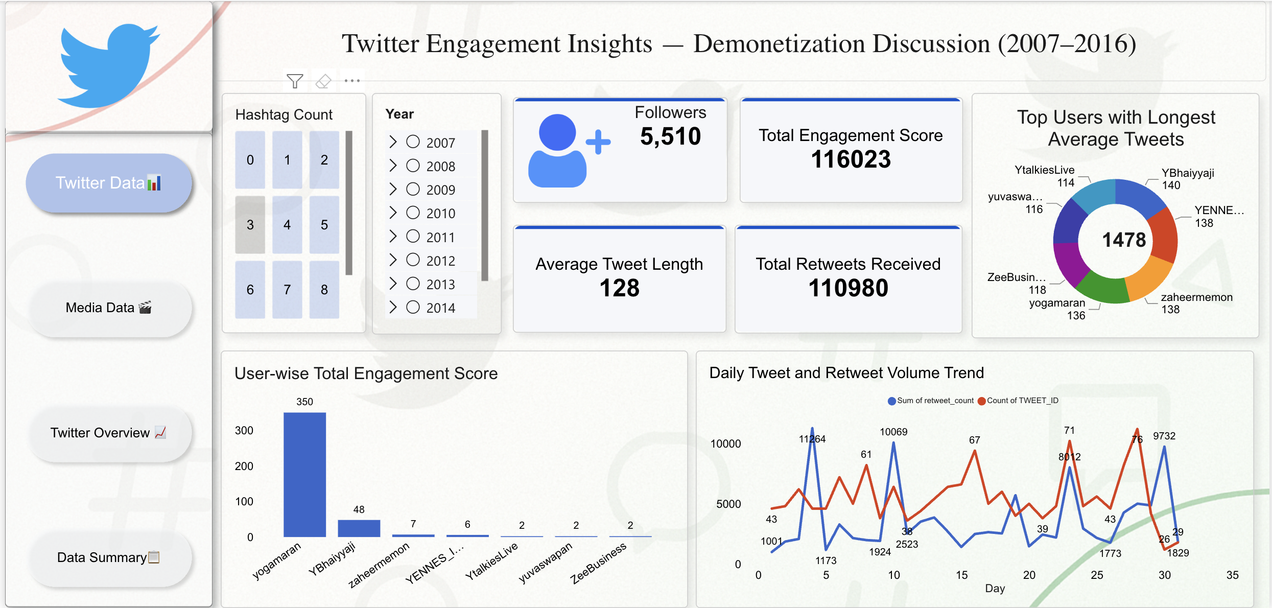 Analyse and evaluate Twitter activity, audience engagement, and media performance with this Twitter Analytics and Engagement Power BI dashboard template, built to give social media analysts, digital marketing teams, and communications professionals a structured, multi-page view of tweet trends, user interactions, and content performance over time. The dashboard tracks all essential social media KPIs including total followers, engagement scores, retweet counts, total tweet volume, and average tweet length — giving teams a clear picture of how content resonates with audiences and which users and hashtags drive the highest levels of interaction. Additional metrics cover daily tweet activity patterns, top-performing user rankings, hashtag distribution analysis, and media type engagement comparisons between photo and video content, helping digital marketing and communications teams refine content strategy and identify peak engagement windows. This template is designed for social media managers, digital marketing strategists, communications analysts, and brand researchers who need a reliable, visual tool for social listening, campaign evaluation, and audience behaviour analysis. Visuals include daily tweet activity line charts, hashtag performance bar charts, engagement score KPI cards, media type donut charts, retweet trend indicators, and gauge visuals — with interactive slicers for year, media type, hashtag, and user-level metrics enabling flexible drill-down exploration. Download this Twitter Analytics and Engagement Power BI dashboard template, open the PBIX file in Power BI Desktop, and start turning social data into smarter digital marketing decisions today.