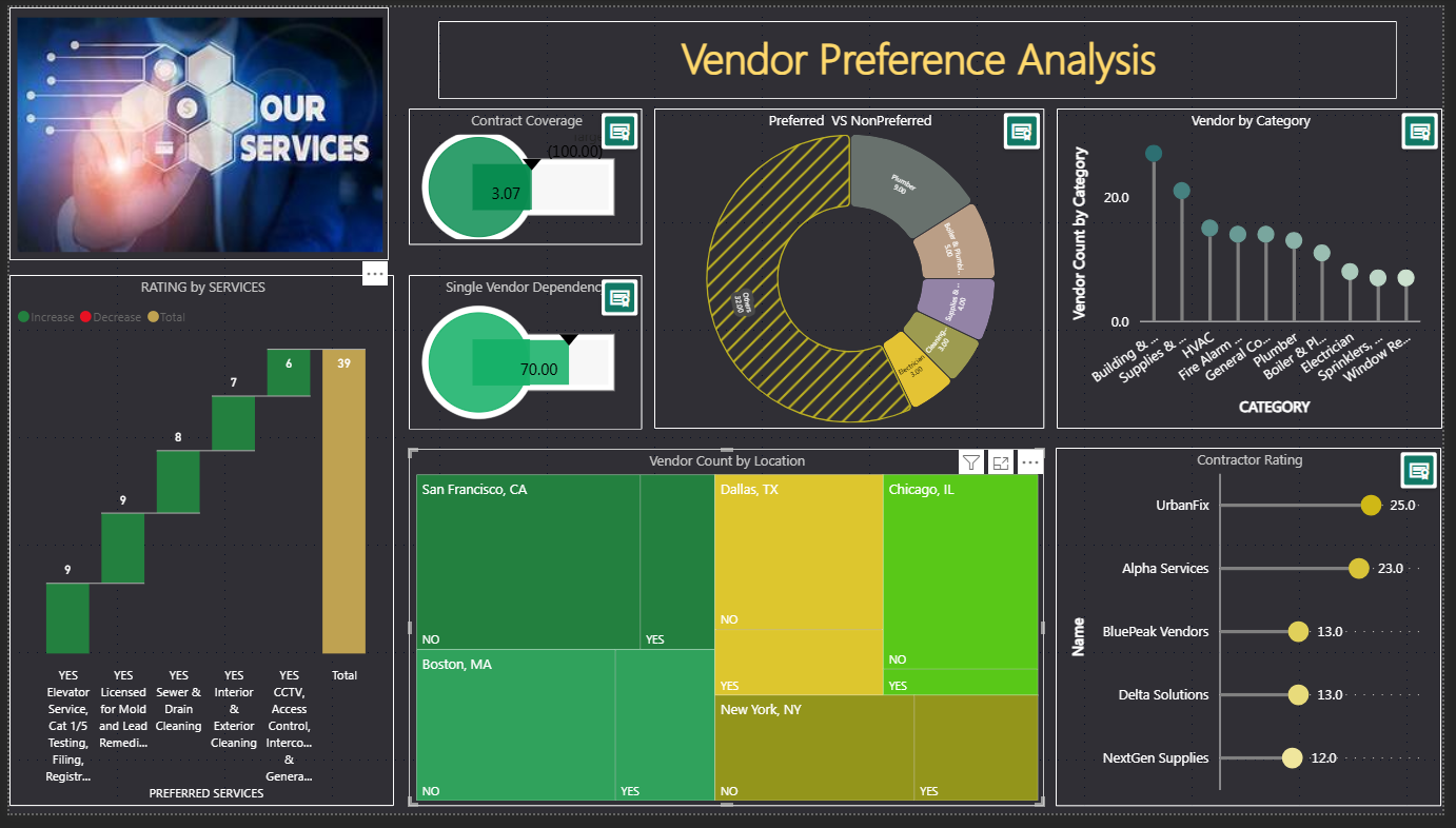 The Procurement Analytics Power BI Dashboard Template helps analyze vendor performance, service preferences, and contract coverage across locations and categories. This Procurement Analytics Power BI Dashboard Template includes key metrics such as preferred vs non-preferred vendors, contract coverage, vendor dependency, and contractor ratings to evaluate supplier performance effectively. It also highlights vendor distribution by service category and location along with preferred service analysis. Designed for procurement teams, supply chain managers, and business analysts, this Procurement Analytics Power BI Dashboard Template helps identify high-performing vendors, reduce dependency risks, and improve supplier selection. It solves challenges related to tracking vendor performance and optimizing procurement efficiency. The dashboard includes visuals such as vendor count by location charts, rating comparison graphs, category-based vendor analysis, and KPI cards for quick insights. Interactive filters allow users to explore data by service category, location, and vendor type for deeper analysis. Download this Procurement Analytics Power BI Dashboard Template and start analysing vendor performance and procurement efficiency today.
