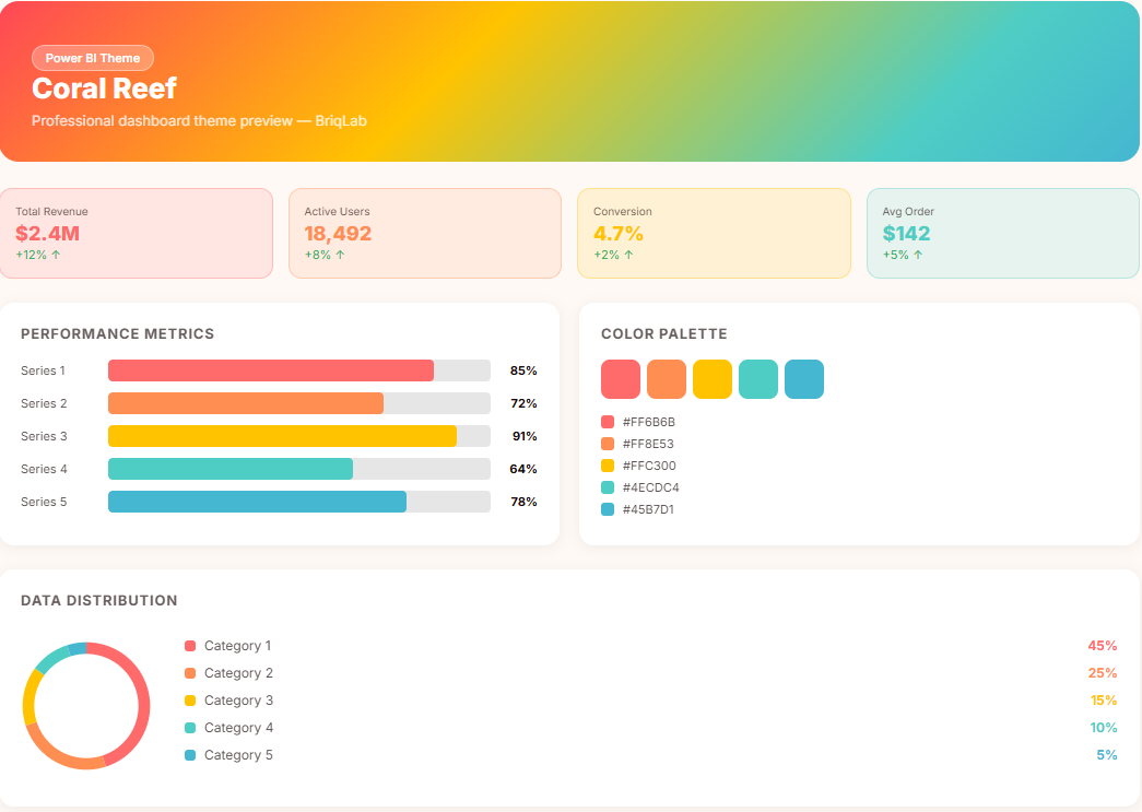 Here is the fully optimised SEO output for this theme: New Title: Tropical Coral Power BI Theme – Coral Reef | Free JSON Download Meta Title: Tropical Coral Power BI Theme – Coral Reef | BriqLab (56 characters) Meta Description: Download the Coral Reef tropical Power BI theme. Warm coral, teal and yellow palette with JSON file for Power BI Desktop. Built for marketing and travel dashboards. (155 characters) URL Slug: tropical-coral-power-bi-theme-coral-reef H1: Tropical Coral Power BI Theme – Coral Reef | Free JSON Download Image Alt Text: Tropical coral Power BI theme preview showing Coral Reef colour palette of warm corals, teals and sunshine yellows applied to a marketing and travel industry analytics dashboard Description: The Coral Reef is a tropical coral Power BI theme crafted for marketing, travel, and leisure industry dashboards where data needs to feel as vivid, energetic, and engaging as the audiences and destinations being analysed. This Power BI theme draws from a rich, diverse palette of warm corals, ocean teals, and sunshine yellows — a combination that brings natural vibrancy and visual depth to every report element while maintaining clear data differentiation across categories. The breadth of the colour palette makes it particularly effective for multi-series charts, campaign comparison visuals, and segment breakdowns where distinct, readable colour separation is essential. Warm tones anchor the layout while cooler teals provide contrast and balance, creating a visual rhythm that feels dynamic yet structured. It is ideally suited to travel agencies, tourism boards, leisure operators, and marketing teams building dashboards for campaign performance, destination analytics, customer acquisition, and seasonal trend reporting. Consumer lifestyle brands and hospitality groups will find the palette immediately aligned with the warmth and energy of their brand environments. The theme is delivered as a JSON file fully compatible with all versions of Power BI Desktop and ready to apply across your complete report suite in seconds. Download this tropical coral Power BI theme, import the JSON file into Power BI Desktop, and give your marketing and travel dashboards a vibrant, sun-drenched visual identity that captures the energy of the industries they serve.