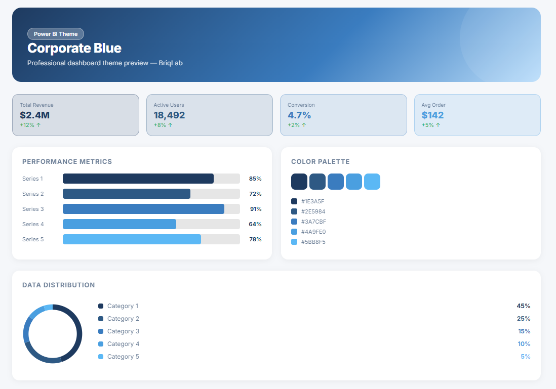 The Corporate Blue is a corporate blue Power BI theme engineered for finance, executive, and board-level reporting dashboards where the timeless visual language of institutional authority, professional reliability, and organisational confidence needs to underpin every design decision across the entire report environment. This Power BI theme draws from a classic palette of deep corporate navy, structured royal blue, and composed mid-blue tones set against clean, professional neutral backgrounds — a combination that has defined the visual identity of financial institutions, global corporations, and executive reporting environments for decades, and continues to communicate trust, stability, and analytical rigour with undiminished authority. The structured depth of the corporate blue palette creates a report environment that feels immediately familiar and professionally credible to board members, executive stakeholders, and senior finance audiences — guiding directors, CFOs, and governance teams through financial performance data, strategic KPI scorecards, and board reporting packs with a visual composure that inspires confidence at every level. Carefully calibrated lighter blue accent tones establish precise visual hierarchy across data tables, trend analytics, and performance indicators while preserving the cohesive, authoritative character of the overall design. It is particularly well-suited to financial institutions, listed corporations, professional services firms, investment management organisations, and corporate governance teams building dashboards for board performance reporting, financial results presentation, investor relations analytics, strategic objective tracking, and executive decision-support data. Company secretaries, investor relations directors, and senior finance reporting teams who need reports that meet the highest standards of corporate presentation and board-level visual professionalism will find this palette a definitive and immediately authoritative fit. The theme is delivered as a JSON file fully compatible with all versions of Power BI Desktop and straightforward to deploy across your complete report suite in seconds. Download this corporate blue Power BI theme, import the JSON file into Power BI Desktop, and give your finance and executive dashboards the classic, authoritative visual identity that board-level reporting and institutional financial communication demands.