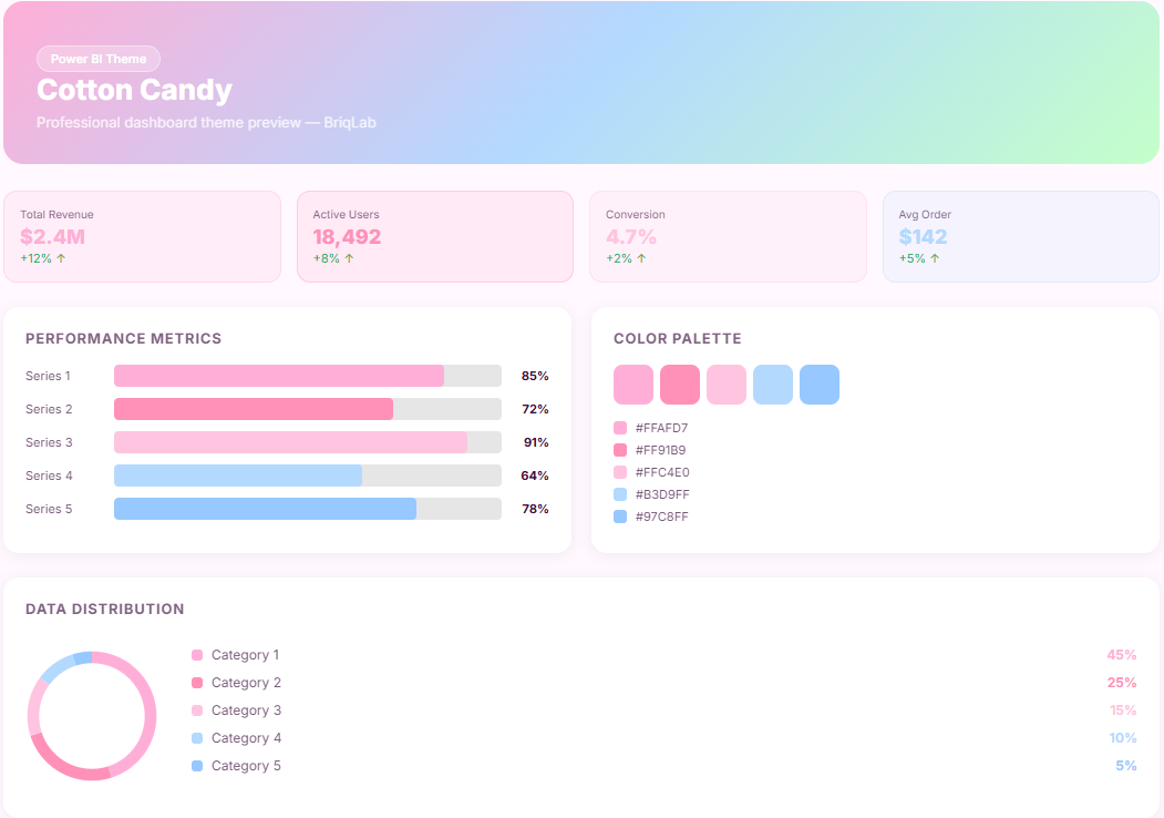 Here is the fully optimised SEO output for this theme: New Title: Pastel Pink Power BI Theme – Cotton Candy | Free JSON Download Meta Title: Pastel Pink Power BI Theme – Cotton Candy | BriqLab (54 characters) Meta Description: Download the Cotton Candy pastel pink Power BI theme. Sweet pastel palette with JSON file for Power BI Desktop. Built for consumer brand and lifestyle dashboards. (155 characters) URL Slug: pastel-pink-power-bi-theme-cotton-candy H1: Pastel Pink Power BI Theme – Cotton Candy | Free JSON Download Image Alt Text: Pastel pink Power BI theme preview showing Cotton Candy colour palette of soft pinks and sweet pastels applied to a consumer brand and lifestyle analytics dashboard Description: The Cotton Candy is a pastel pink Power BI theme designed for consumer brand, children's retail, and lifestyle dashboards where data needs to feel as warm, playful, and approachable as the audiences being served. This Power BI theme draws from a palette of soft pinks, lilac blushes, and light candy tones that bring a joyful, energetic character to every report visual without sacrificing clarity or readability. Gentle pastel layers sit against clean, airy backgrounds to create a layout that feels light and inviting — making KPI cards, trend lines, and category breakdowns feel naturally engaging for brand and marketing teams. Carefully balanced accent tones add structure and visual rhythm while keeping the overall aesthetic cohesive and on-brand. It is particularly well-suited to children's retail brands, toy companies, family lifestyle platforms, and consumer goods organisations building dashboards for sales performance, campaign analytics, audience engagement, and product range reporting. Beauty, wellness, and direct-to-consumer brands will find the palette equally aligned with their visual identity needs. The theme is delivered as a JSON file fully compatible with all versions of Power BI Desktop and simple to apply across your full report suite in seconds. Download this pastel pink Power BI theme, import the JSON file into Power BI Desktop, and give your consumer brand and lifestyle dashboards a playful, characterful identity that resonates with the audiences your business serves.