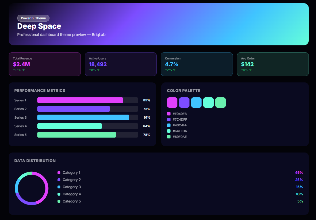 The Deep Space is a dark cosmic Power BI theme engineered for technology, data science, and command centre dashboards where immersive visual depth, futuristic identity, and the ability to handle extreme data density need to be built into the report environment from the ground up. This Power BI theme constructs its palette from neon nebula tones — vivid cosmic purples, interstellar blues, supernova magentas, and stellar greens — detonated across a deep near-black background that gives every data visual the vast, immersive quality of a live command centre display. The contrast between the near-black canvas and the luminous nebula accent tones creates exceptional readability for multi-layered data science visualisations, real-time monitoring dashboards, and complex analytical report environments where numerous data streams need to coexist with complete visual clarity. The cosmic colour palette provides natural, intuitive differentiation across data categories without ever breaking the dark, immersive atmosphere that defines the theme. It is particularly well-suited to data science teams, technology operations centres, AI and machine learning platforms, cybersecurity organisations, and digital infrastructure providers building dashboards for real-time system monitoring, predictive analytics, model performance tracking, and operational command centre displays. Data engineers, ML researchers, and technology directors who need reports that feel as advanced and immersive as the systems and insights they visualise will find this palette a compelling and precisely calibrated fit. The theme is delivered as a JSON file fully compatible with all versions of Power BI Desktop and ready to deploy across your complete report suite in seconds. Download this dark cosmic Power BI theme, import the JSON file into Power BI Desktop, and give your tech and data science dashboards the deep, neon-charged visual identity that futuristic command centre reporting demands.