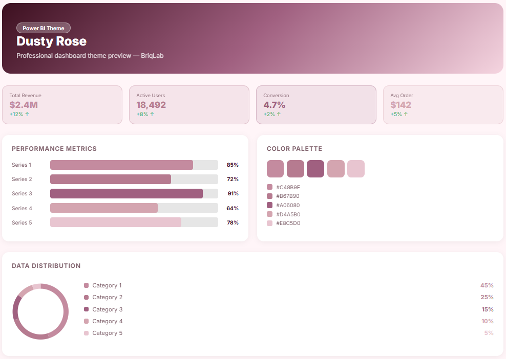 The Dusty Rose is a dusty rose Power BI theme designed for healthcare, women's health, and wellness dashboards where the visual environment must communicate compassion, sensitivity, and a deeply human-centred approach to the data it presents. This Power BI theme draws from a carefully muted palette of dusty rose, soft blush, and faded petal tones set against clean, warm-neutral backgrounds — a combination that carries an innate sense of care, dignity, and emotional intelligence that clinical and wellness environments increasingly demand from their reporting identity. The understated quality of the dusty rose palette creates a report environment that feels considered and empathetic rather than clinical or corporate — guiding healthcare practitioners, wellness programme managers, and patient experience analysts through sensitive outcome data, health engagement metrics, and wellbeing KPIs with a visual language that respects the humanity behind every data point. Soft accent tones provide gentle but clear visual hierarchy across report layouts without disrupting the compassionate, muted character of the overall design. It is particularly well-suited to women's health clinics, maternal care organisations, mental health platforms, wellness brands, and patient experience teams building dashboards for health outcome tracking, programme engagement analytics, patient satisfaction reporting, and population wellbeing measurement. Healthcare designers and clinical data teams who need reports that place human sensitivity and compassionate communication at the centre of every visual decision will find this palette an immediately resonant and purposeful fit. The theme is delivered as a JSON file fully compatible with all versions of Power BI Desktop and straightforward to deploy across your complete report suite in seconds. Download this dusty rose Power BI theme, import the JSON file into Power BI Desktop, and give your healthcare and wellness dashboards the muted, compassionate visual identity that human-centred health data deserves.