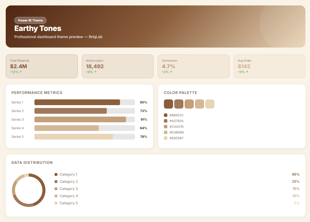A terracotta warm Power BI theme crafted for agriculture, food industry, and natural produce dashboards where the visual environment needs to feel as grounded, organic, and authentically connected to the natural world as the land, produce, and food systems being reported on. This Power BI theme draws from a considered palette of sun-baked terracotta, rich sienna, warm clay, and dry ochre tones set against composed earthy neutral backgrounds — a combination that carries an innate sense of soil, season, and the enduring rhythms of agricultural and food production cycles. The organic warmth of the terracotta and sienna palette creates a report environment that feels honest, grounded, and contextually native to food and agricultural data — guiding farm managers, food producers, and supply chain analysts through crop yield metrics, harvest performance data, and food production KPIs with a visual language that reflects the natural world the numbers represent. Deeper sienna accent tones provide clear structural hierarchy and data differentiation across report layers while reinforcing the cohesive, earthy character of the overall design. It is particularly well-suited to agricultural cooperatives, organic food brands, farm management organisations, food manufacturers, and rural enterprise businesses building dashboards for crop production tracking, soil health analytics, harvest yield reporting, food supply chain performance, and seasonal trading measurement. Sustainability-focused food businesses and farm-to-table organisations who need reports that visually reinforce their connection to natural, organic processes will find this palette a grounded and immediately resonant fit. The theme is delivered as a JSON file fully compatible with all versions of Power BI Desktop and straightforward to deploy across your complete report suite in seconds. Download this terracotta warm Power BI theme, import the JSON file into Power BI Desktop, and give your agriculture and food industry dashboards the warm, organic visual identity that connects every data point authentically to the natural world it represents.