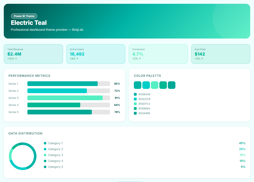 The Electric Teal is an electric teal Power BI theme crafted for healthcare, wellness, and wellbeing brand dashboards where clinical precision and fresh, energetic visual confidence need to exist in equal and carefully balanced measure. This Power BI theme draws from a vivid palette of electric teal, fresh mint, and crisp aqua tones set against clean, light-neutral backgrounds — a combination that carries the instinctive associations of health, trust, and vitality that wellness and clinical environments demand from their visual identity. The brightness and clarity of the teal and mint palette creates a report environment that feels simultaneously energising and reassuring — guiding clinicians, wellness operators, and health brand analysts through patient outcome data, programme performance metrics, and wellbeing KPIs with a visual language that feels native to the sector. Vivid teal accent tones provide sharp, precise differentiation across data categories while maintaining the fresh, clean character of the overall design. It is particularly well-suited to healthcare providers, wellness platforms, fitness technology companies, mental health organisations, and consumer health brands building dashboards for patient engagement tracking, wellness programme analytics, clinical performance reporting, and health outcome measurement. Brand and marketing teams within health and wellbeing organisations will find the palette immediately aligned with the trust-forward, energetic visual standards their sector requires. The theme is delivered as a JSON file fully compatible with all versions of Power BI Desktop and straightforward to deploy across your complete report suite in seconds. Download this electric teal Power BI theme, import the JSON file into Power BI Desktop, and give your healthcare and wellness dashboards the fresh, vivid visual identity that combines clinical trust with the energetic confidence modern health brands demand.