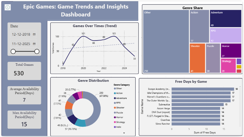 The Epic Games Analytics is a modern gaming Power BI theme designed to create a clean and data-focused dashboard experience. This Power BI theme uses a soft slate-blue background with deep navy accents to establish hierarchy across titles, KPIs, and performance indicators. Muted grey and white containers provide clear separation between visuals, while complementary colours like purple, teal, and orange distinguish genre categories and distribution trends. This Power BI theme is ideal for gaming analytics dashboards, platform performance tracking, and digital content analysis. It suits analysts, developers, and business teams who need structured and visually consistent reports for trend analysis and decision-making. The theme supports trend charts, genre breakdown visuals, availability metrics, and KPI cards with strong visual hierarchy and readability. It can be applied easily by importing the JSON file into Power BI Desktop. Download this modern gaming Power BI theme and apply a clean, structured design to your analytics dashboards instantly.