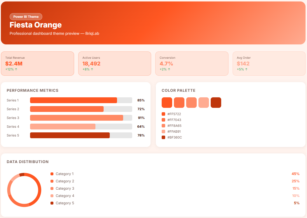 The Fiesta is a fiesta orange Power BI theme built for marketing, events, and consumer brand dashboards where high visibility, infectious energy, and immediate audience engagement need to be embedded into the visual fabric of every report. This Power BI theme draws from a bold palette of energetic orange, vivid tangerine, and warm amber highlight tones that command attention and communicate enthusiasm across every chart type, campaign KPI card, and performance summary layout. The high-visibility nature of the orange palette makes it instinctively effective for engagement metric dashboards, event performance reviews, and campaign analytics where drawing stakeholder attention to standout results, conversion milestones, and audience reach figures is central to how the data must land. Clean neutral backgrounds balance the intensity of the accent tones and ensure comfortable readability across both summary and detail report layers. It is particularly well-suited to marketing agencies, event management companies, experiential brand teams, and consumer goods organisations building dashboards for campaign performance tracking, audience engagement analytics, event attendance reporting, and brand activation measurement. Social media managers, growth marketers, and creative directors who need reports that match the energy of the campaigns they run will find this palette a natural and immediate fit. The theme is delivered as a JSON file fully compatible with all versions of Power BI Desktop and ready to deploy across your complete report suite in seconds. Download this fiesta orange Power BI theme, import the JSON file into Power BI Desktop, and give your marketing and events dashboards the bold, high-energy visual identity that drives engagement and makes every campaign result impossible to ignore.