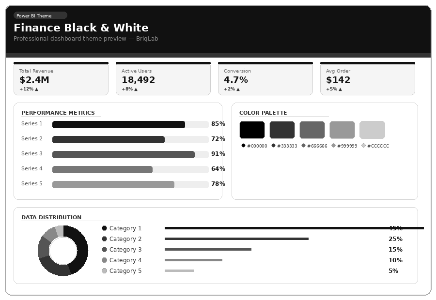 The Finance Dark Professional theme is designed to deliver a sleek, modern, and highly focused visual experience. Using a dark background with subtle gradients, this theme reduces visual strain while allowing key financial metrics to stand out clearly. Dark tones such as charcoal, navy, or black create a sense of sophistication, stability, and authority—qualities that align strongly with financial analysis and reporting. Accent colors like gold, teal, or light green are used strategically to highlight critical data such as revenue, profit margins, and growth trends. These contrasting elements ensure that important insights are immediately noticeable without overwhelming the viewer. The theme also enhances readability by using clean typography and well-defined chart elements. Overall, the Dark Professional theme is ideal for financial dashboards as it conveys precision, clarity, and confidence, enabling users to analyze data efficiently and make informed business decisions.