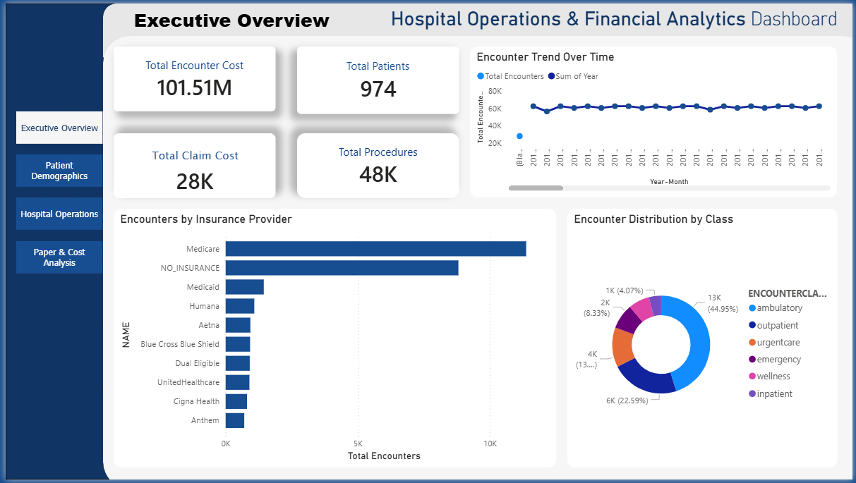 The Hospital Executive is a hospital executive navy Power BI theme engineered for healthcare leadership, hospital management, and board-level financial performance dashboards where corporate navy authority, institutional trust, and a structured executive aesthetic need to present patient analytics, operational trend data, and financial performance metrics with the clarity, visual hierarchy, and professional sophistication that hospital governance and healthcare leadership reporting demands. This Power BI theme builds its palette around deep corporate navy tones combined with soft grey panel surfaces — a combination that instinctively conveys the stability, reliability, and institutional credibility that healthcare executive environments require — while carefully structured teal, orange, and purple accent colours provide subtle, precise differentiation across encounter class distributions, insurance category comparisons, and operational performance breakdowns without compromising the composed executive tone that board-level healthcare reporting demands. The commanding visual architecture of the hospital executive navy palette — deep blue structural authority, neutral grey panel clarity, and purposefully restrained accent differentiation — creates a boardroom-ready report environment that guides hospital executives, healthcare finance directors, and clinical operations leads through financial performance KPIs, patient volume analytics, encounter class distributions, and operational trend comparisons with effortless analytical clarity and confident executive composure. Large KPI card styling ensures that headline financial and operational metrics remain the unambiguous focal point of every dashboard layer — commanding immediate board-level attention and communicating institutional performance with the visual weight that healthcare governance reporting requires. It is particularly well-suited to hospital management teams, healthcare finance functions, clinical operations analytics practices, health system executive reporting departments, and board governance teams building dashboards for hospital financial performance tracking, patient encounter analytics, insurance distribution reporting, operational efficiency measurement, and healthcare executive KPI scorecard management. Hospital CEOs, healthcare finance directors, and clinical analytics leads who need reports that project the corporate authority, institutional reliability, and board-ready visual sophistication that serious hospital management and healthcare leadership reporting demands will find this palette a precisely calibrated and immediately compelling fit. The theme is delivered as a JSON file fully compatible with all versions of Power BI Desktop and ready to deploy across your complete hospital analytics and healthcare executive reporting suite in seconds. Download this hospital executive navy Power BI theme, import the JSON file into Power BI Desktop, and give your hospital management and healthcare leadership dashboards the deep navy visual identity that corporate institutional authority and board-level healthcare reporting demands.