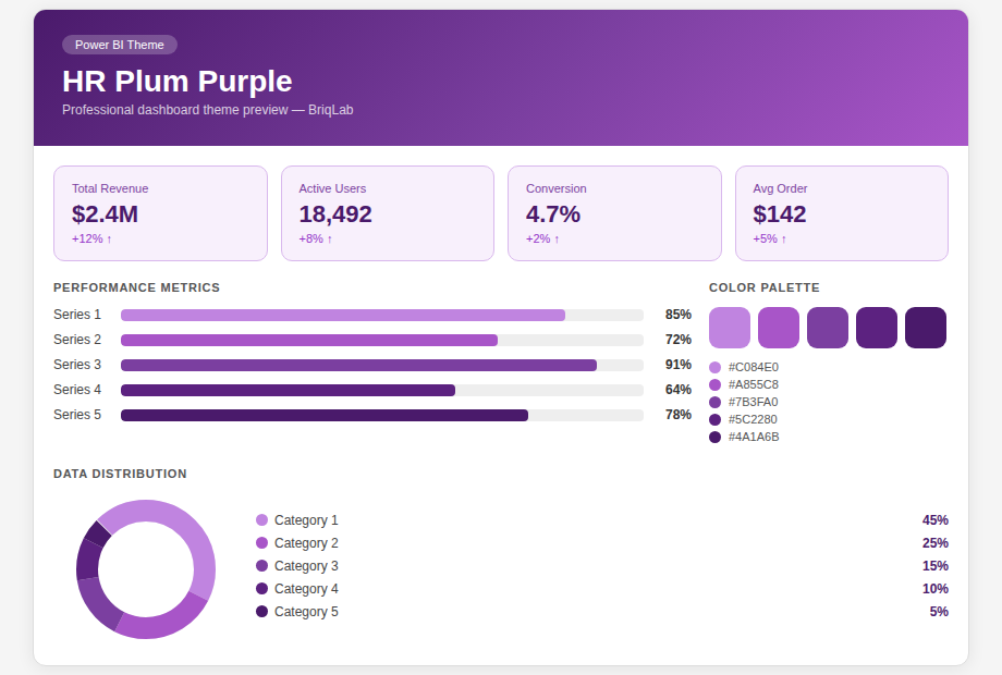The HR Purple Plum theme uses rich shades of purple and plum to create a sophisticated, people-centric, and calming visual experience. Purple is often associated with empathy, creativity, and insight—qualities that align well with human resource functions such as employee engagement, development, and well-being. Plum tones add depth and warmth, making the dashboard feel more approachable while maintaining professionalism. In this theme, lighter shades of purple provide a soft and clean background, ensuring readability, while deeper plum tones highlight key HR metrics such as employee retention, hiring trends, performance, and satisfaction levels. Accent colors can be used subtly to draw attention to important insights without overwhelming the viewer. Overall, the Purple Plum theme creates a balanced and elegant interface that supports clear communication of HR data, encourages thoughtful analysis, and enhances the overall user experience.