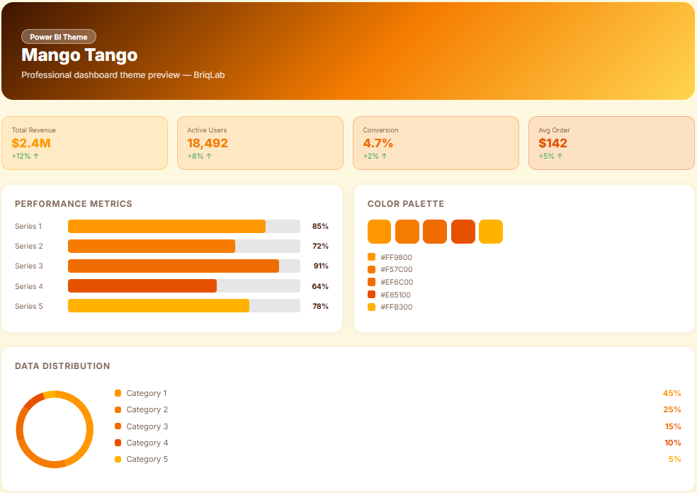 The Mango Tango is a warm orange Power BI theme crafted for retail, food, and consumer goods dashboards where data needs to feel as energetic, appetising, and immediately engaging as the products and purchasing behaviours being analysed. This Power BI theme draws from a vibrant palette of juicy mango orange, sun-warmed amber, and golden highlight tones that bring a playful yet purposeful visual energy to every chart, KPI card, and performance summary across the report layout. The warmth and saturation of the orange and amber palette naturally draws the eye toward trend lines, bestseller callouts, and performance highlights — making it an instinctively effective choice for reports where directing stakeholder attention to standout data points is as important as the data itself. Lighter background tones balance the vibrancy of the accent palette and maintain clean, comfortable readability across dense retail data environments. It is particularly well-suited to FMCG brands, food retailers, e-commerce operators, and consumer goods manufacturers building dashboards for sales performance, product range analytics, category trend reporting, and promotional campaign tracking. Merchandising teams and brand managers who need reports that feel as dynamic and consumer-facing as the markets they operate in will find this palette an immediately compelling fit. The theme is delivered as a JSON file fully compatible with all versions of Power BI Desktop and straightforward to deploy across your complete report suite in seconds. Download this warm orange Power BI theme, import the JSON file into Power BI Desktop, and give your retail and consumer goods dashboards a vibrant, sun-warmed visual identity that makes every trend, highlight, and bestseller impossible to miss.