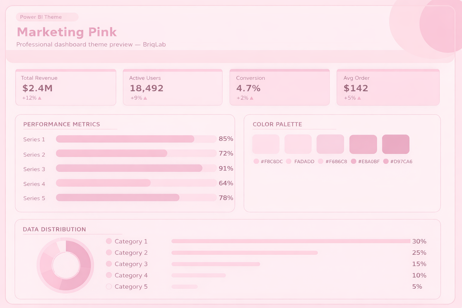 The Pastel Pink theme transforms the dashboard into a soft, elegant, and visually calming interface. Unlike bold pink tones, pastel pink shades create a gentle and minimal aesthetic that improves readability while maintaining a modern and professional look. Light blush and soft rose tones are used for backgrounds and cards, ensuring a clean and airy layout. Key metrics and highlights are emphasized using slightly deeper pastel shades, allowing important insights to stand out without overwhelming the viewer. The subtle contrast between soft pink tones enhances visual hierarchy while keeping the overall design smooth and cohesive. This theme is ideal for dashboards that require a friendly, approachable, and refined appearance, making it especially suitable for marketing, lifestyle, or user-focused analytics.