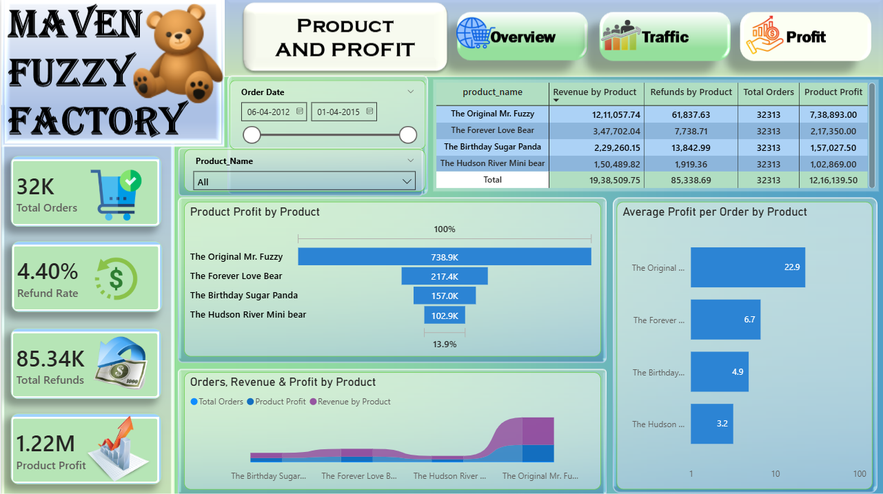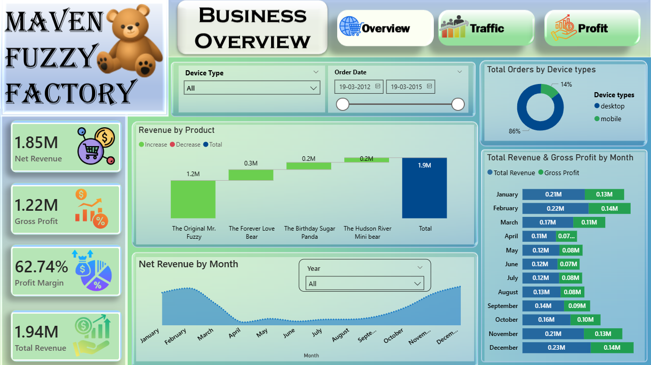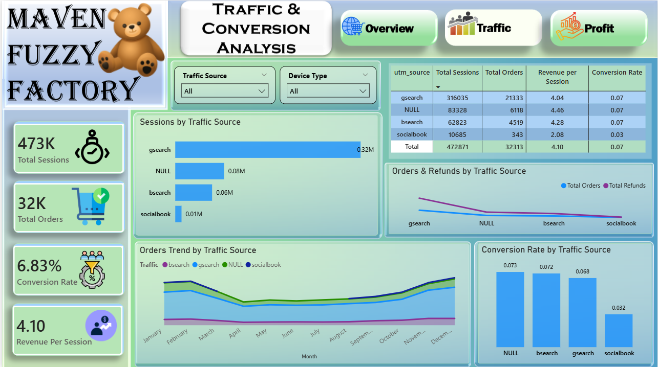 The Maven Fuzzy Factory is a mint teal executive Power BI theme engineered for revenue performance, marketing effectiveness, and conversion analytics dashboards where a clean, premium visual environment needs to present multi-dimensional business data — spanning profit, traffic, and conversion metrics — within a single, cohesive, and strategically structured reporting solution. This Power BI theme builds its palette around fresh mint and premium teal tones set against clean, high-readability backgrounds — a combination that delivers a modern, executive-ready aesthetic that feels simultaneously approachable and analytically rigorous across every KPI card, waterfall chart, trend line, and product profitability comparison layout. The mint teal palette creates a visually unified report environment that guides strategic decision-makers through total revenue figures, gross profit analytics, profit margin tracking, session volume data, and conversion rate performance with effortless visual flow and precise data hierarchy. Dynamic filtering capability across product categories, device types, traffic sources, and date ranges is visually supported by the clean, structured design language — ensuring that interactive slicer selections never disrupt the coherence or readability of the overall dashboard layout. It is particularly well-suited to e-commerce businesses, digital marketing teams, product analytics functions, and growth strategy organisations building dashboards for product profitability analysis, marketing channel effectiveness reporting, monthly performance trend monitoring, conversion rate optimisation tracking, and integrated revenue and traffic performance measurement. Growth directors, digital analysts, and e-commerce strategy leads who need reports that combine premium visual design with the analytical depth required for confident, data-driven strategic decision-making will find this palette a precisely calibrated and immediately compelling fit. The theme is delivered as a JSON file fully compatible with all versions of Power BI Desktop and ready to deploy across your complete analytics reporting suite in seconds. Download this mint teal executive Power BI theme, import the JSON file into Power BI Desktop, and give your revenue and conversion analytics dashboards the clean, premium visual identity that integrated business performance monitoring and executive-grade strategic reporting demands.