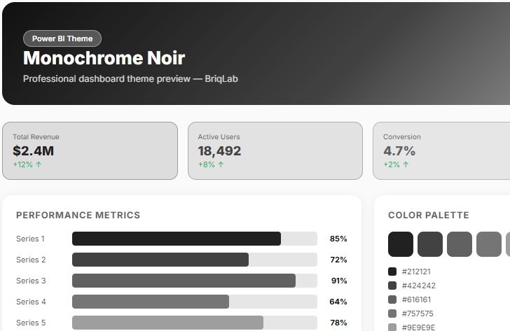 The Noir is a monochrome Power BI theme engineered for financial services, legal, and compliance dashboards where absolute data clarity, zero visual distraction, and uncompromising professionalism define every design decision. This Power BI theme works exclusively within a disciplined palette of pure black, structured mid-greys, and crisp white — stripping every unnecessary visual element away to leave only the data, the hierarchy, and the insight. The absence of colour is itself the design statement. Carefully calibrated grey tones create a precise visual hierarchy across headings, data labels, chart elements, and background layers — ensuring that every report component earns its place through structure and clarity alone. The result is a report environment that communicates total analytical rigour and institutional confidence. It is ideally suited to law firms, investment banks, audit practices, compliance teams, and financial advisory organisations building dashboards for regulatory reporting, case analytics, portfolio performance, and risk exposure summaries. Any organisation where the weight of the data must speak without visual embellishment will find this palette exactly right. The theme is delivered as a JSON file fully compatible with all versions of Power BI Desktop and straightforward to deploy across your entire report library in seconds. Download this monochrome Power BI theme, import the JSON file into Power BI Desktop, and give your financial and legal dashboards the precise, distraction-free visual authority that serious data-first reporting demands.