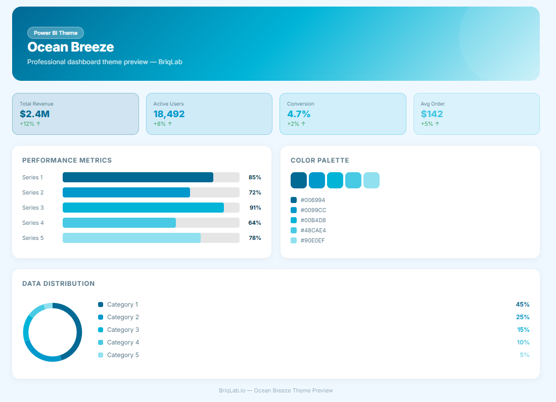 The Ocean Breeze is an ocean breeze Power BI theme crafted for healthcare, professional services, and analytics dashboards where a calming, trust-forward visual environment, deep blue authority, and the refreshing clarity of aqua tones need to work in measured harmony across every report element and data layout. This Power BI theme draws from a considered palette of deep ocean blue, clear aquamarine, soft teal, and coastal aqua tones set against clean, composed neutral backgrounds — a combination that carries the instinctive associations of trustworthiness, professional calm, and analytical clarity that healthcare and data-intensive reporting environments consistently demand. The depth and serenity of the ocean blue and aqua palette creates a report environment that feels simultaneously authoritative and approachable — guiding healthcare analysts, clinical data teams, and professional services stakeholders through patient outcome data, performance analytics, and operational KPIs with a visual language that inspires confidence and communicates care in equal measure. Deeper blue accent tones establish precise structural hierarchy across data tables, trend visuals, and KPI indicators while the lighter aqua tones maintain the open, refreshing character that defines the overall palette identity. It is particularly well-suited to healthcare providers, clinical research organisations, health technology companies, professional analytics practices, and data consultancies building dashboards for patient performance tracking, clinical outcome reporting, operational analytics, programme effectiveness measurement, and professional client reporting. Healthcare data leads, analytics directors, and professional services teams who need reports that project trustworthiness, calm authority, and deep analytical credibility at every stakeholder touchpoint will find this palette a precise and immediately resonant fit. The theme is delivered as a JSON file fully compatible with all versions of Power BI Desktop and straightforward to deploy across your complete report suite in seconds. Download this ocean breeze Power BI theme, import the JSON file into Power BI Desktop, and give your healthcare and analytics dashboards the deep, calming visual identity that ocean-inspired professionalism and trustworthy data reporting demands.