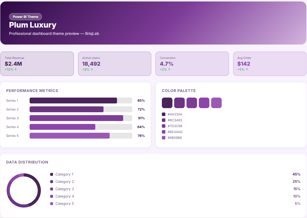 The Plum is a luxury plum Power BI theme designed for high-end retail, fashion, and premium brand dashboards where the visual environment must communicate the same exclusivity, refinement, and considered elegance as the brands and products being reported on. This Power BI theme draws from a palette of rich plum, deep aubergine, and soft violet tones set against dark, sophisticated neutral backgrounds that project unmistakable premium positioning across every report element. Depth and restraint define the visual character of this palette ā jewel-toned plum accents are deployed with precision against layered dark backgrounds, creating a report environment that feels curated and intentional rather than decorative. The tonal range between deep purple and lighter violet provides natural visual hierarchy across KPI cards, trend lines, and category breakdowns. It is particularly well-suited to luxury fashion houses, premium retail groups, jewellery brands, and high-end hospitality organisations building dashboards for brand performance, product category analytics, customer lifetime value reporting, and premium segment tracking. Creative agencies and brand consultancies working with luxury clients will find the palette immediately aligned with the visual standards their work demands. The theme is delivered as a JSON file fully compatible with all versions of Power BI Desktop and straightforward to deploy across your complete report suite in seconds. ā Download this luxury plum Power BI theme, import the JSON file into Power BI Desktop, and give your fashion and premium brand dashboards the regal, sophisticated visual identity that positions your reporting at the same level as the brands it represents.